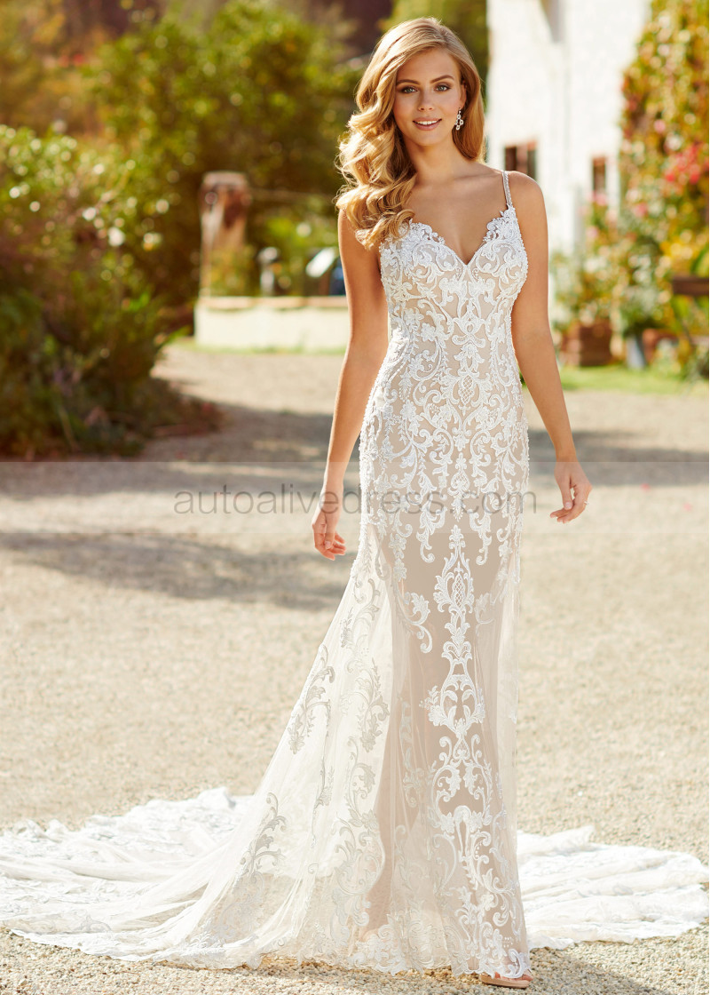 Three Piece Beaded Spaghetti Straps Ivory Lace Tulle Wedding Dress
