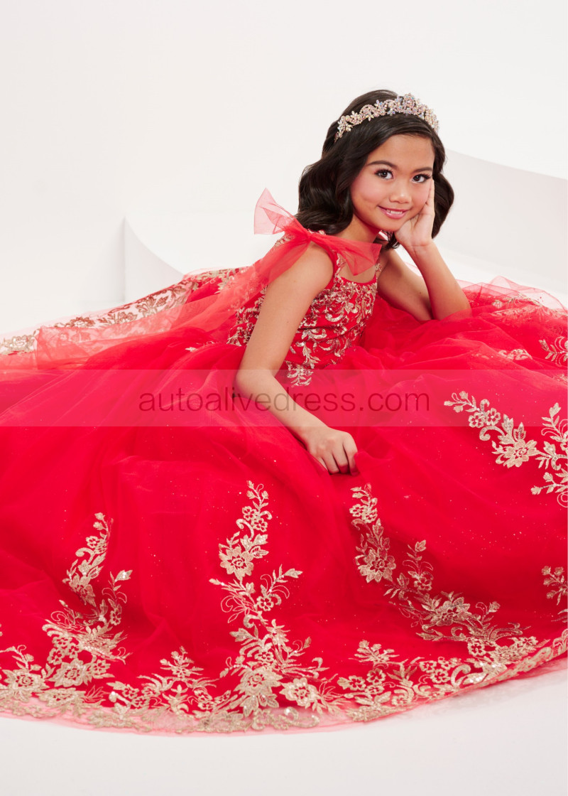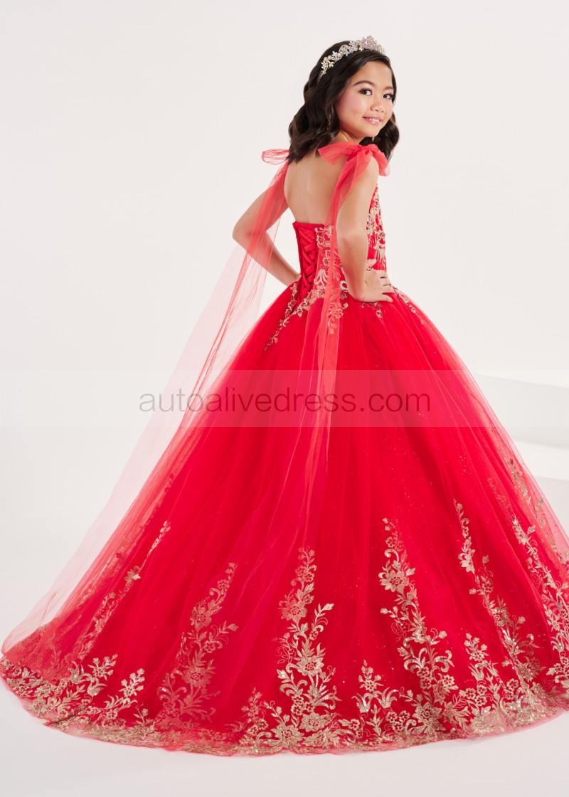 Tie Straps Gold Lace Red Glitter Tulle Fashion Flower Girl Dress