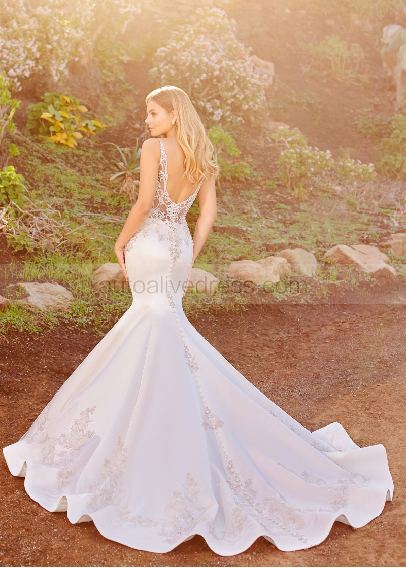 V Neck Beaded Ivory Lace Satin Wedding Dress