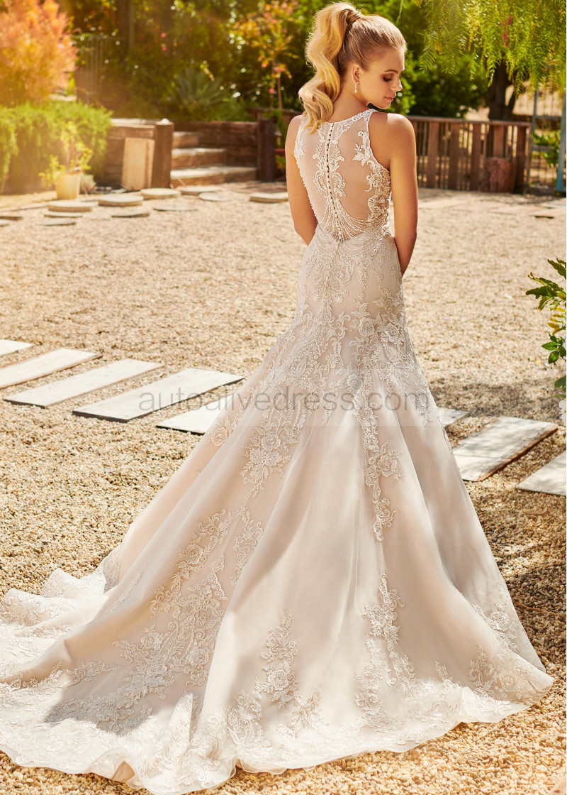 V Neck Beaded Lace Organza Illusion Buttons Back Wedding Dress