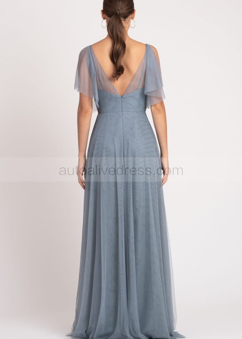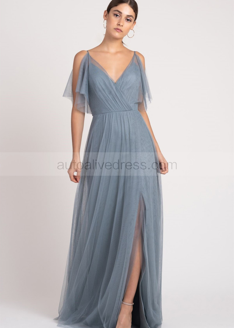 V Neck Blue Gray Tulle Slit Bridesmaid Dress