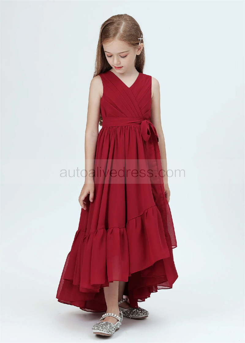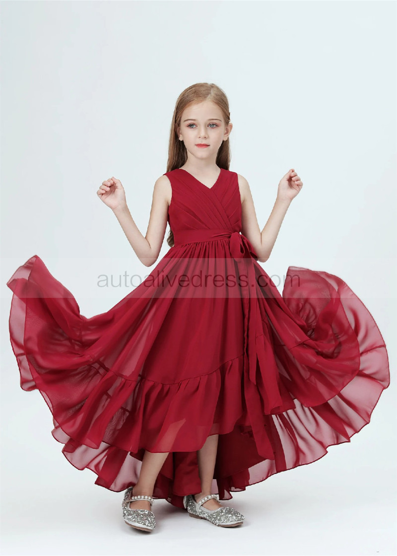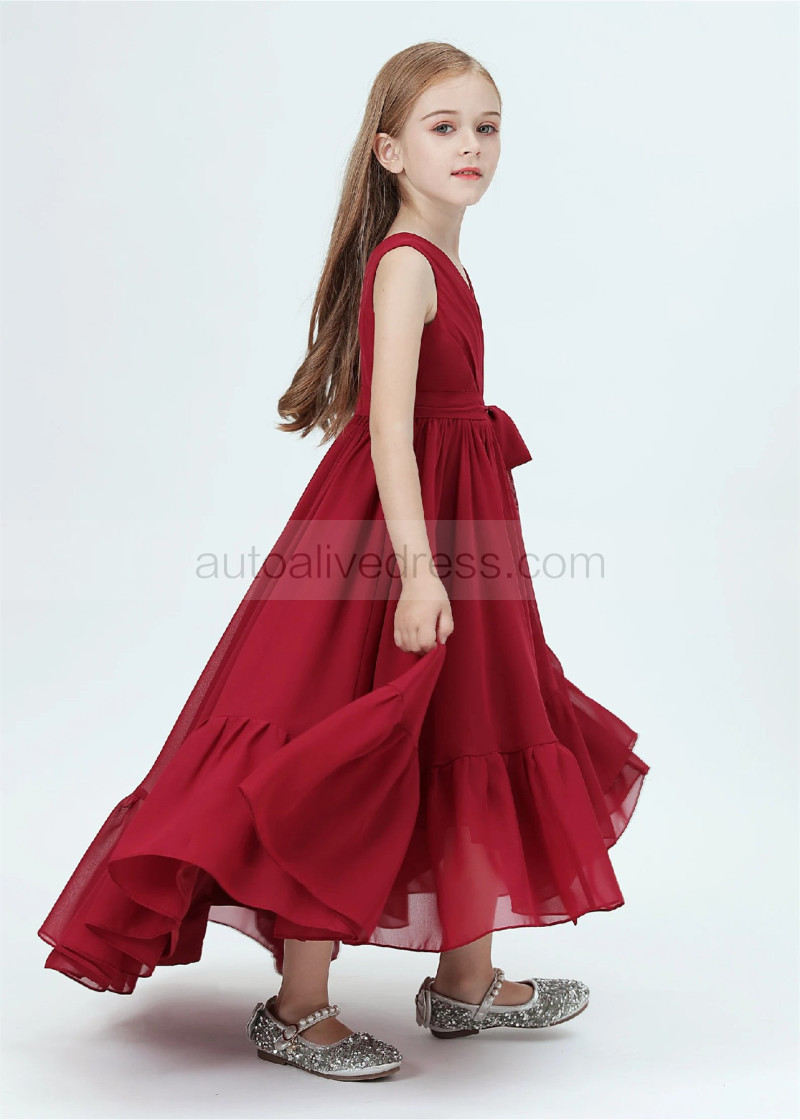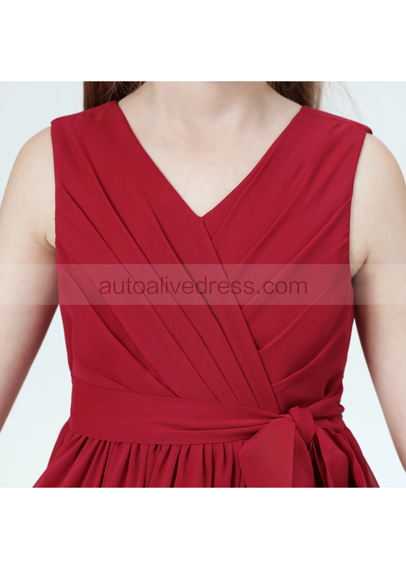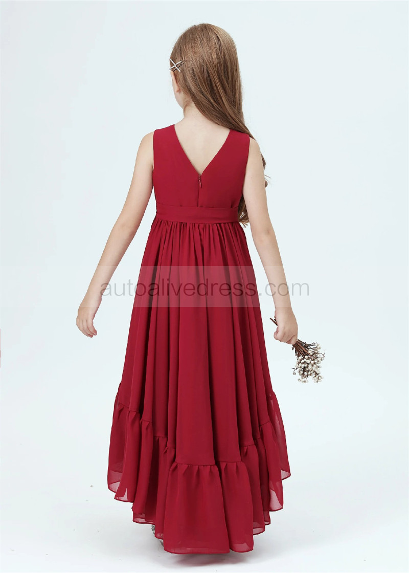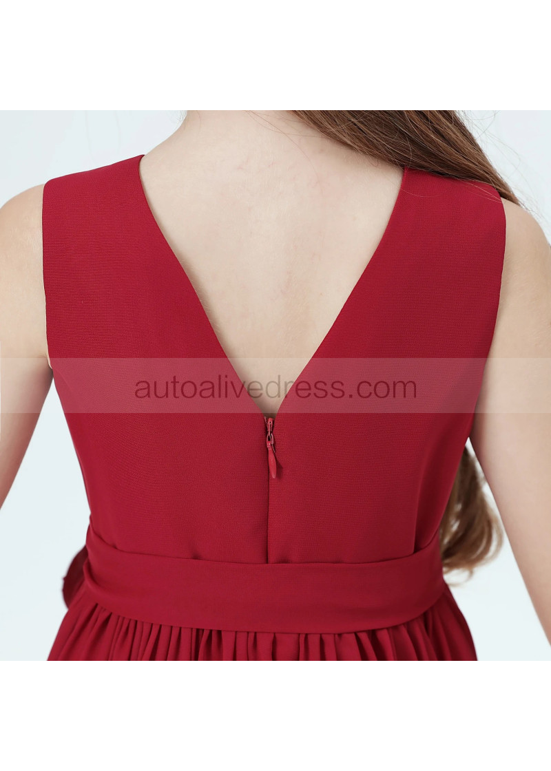 V Neck Burgundy Pleated Chiffon Junior Bridesmaid Dress