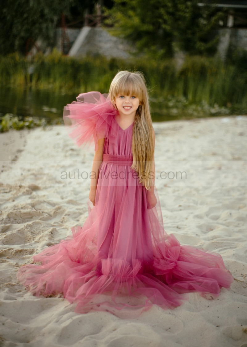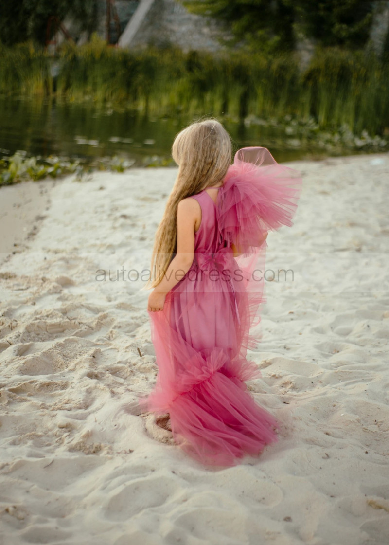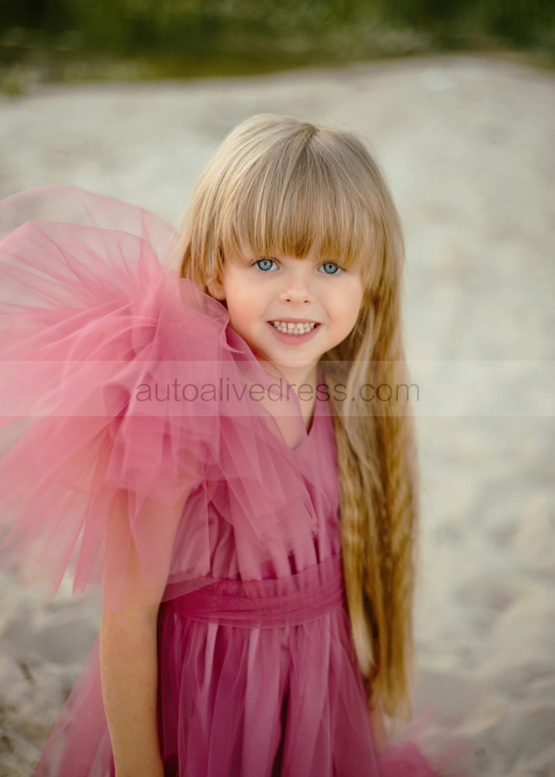V Neck Dusty Rose Tulle Maxi Flower Girl Dress