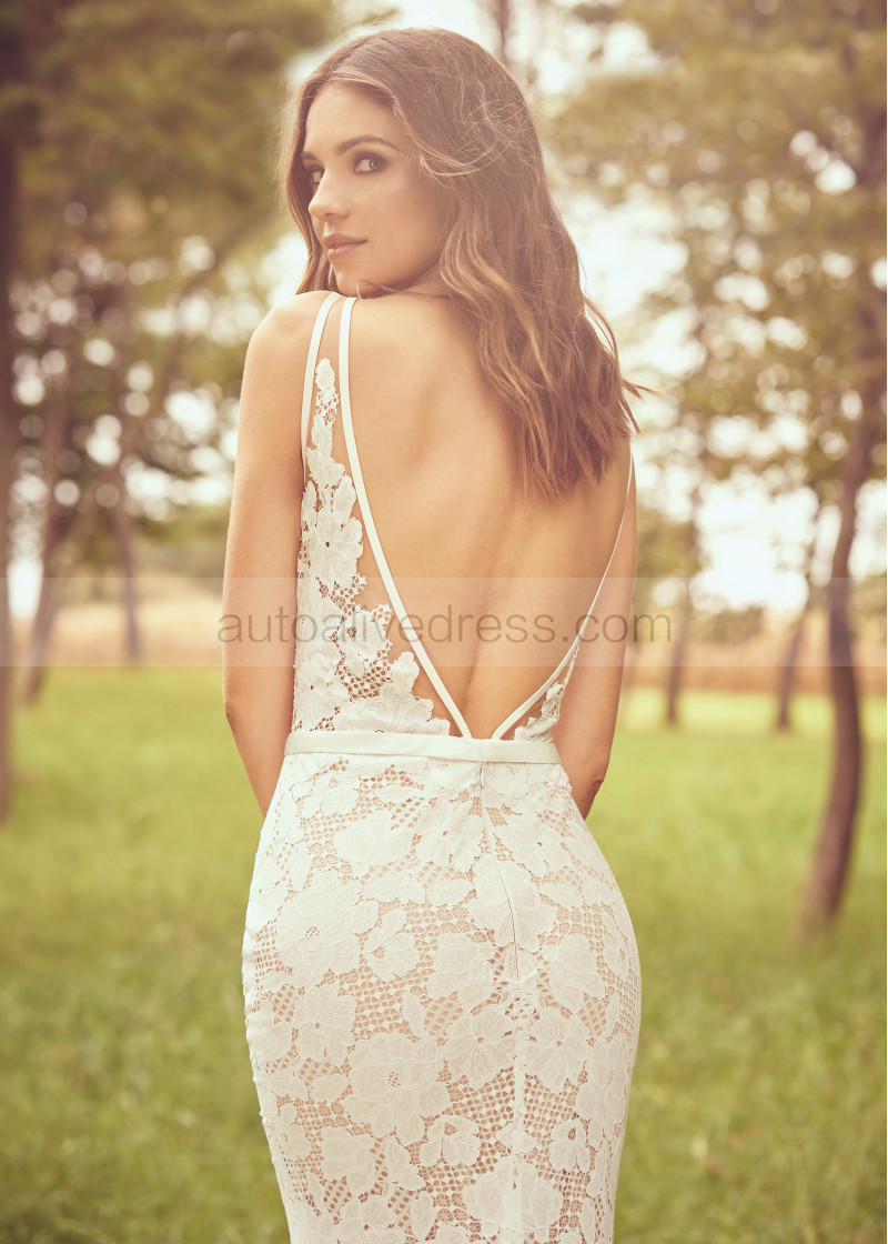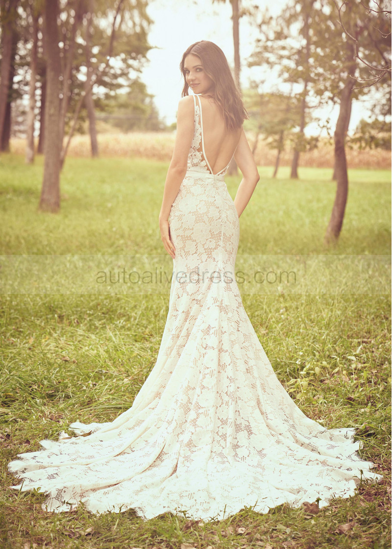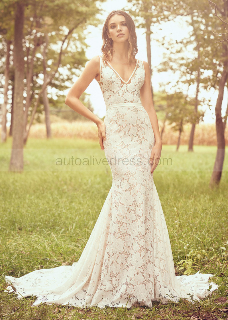 V Neck Ivory Lace Boho Wedding Dress With Champagne Lining