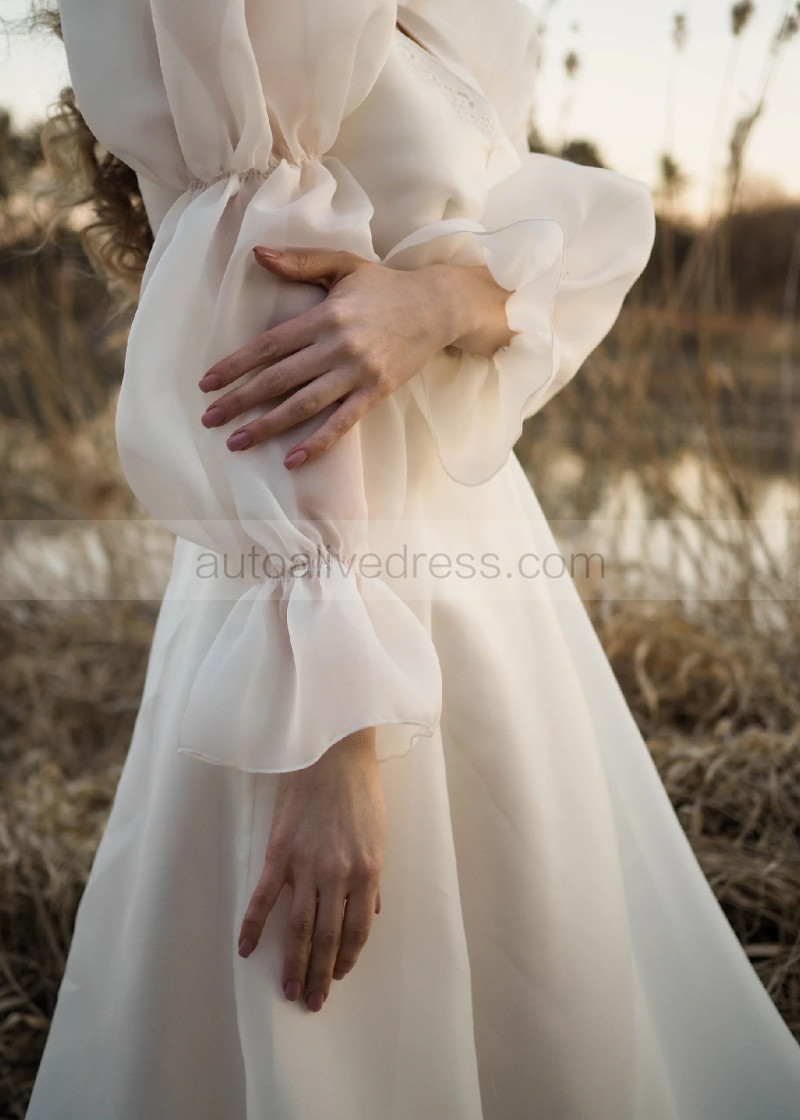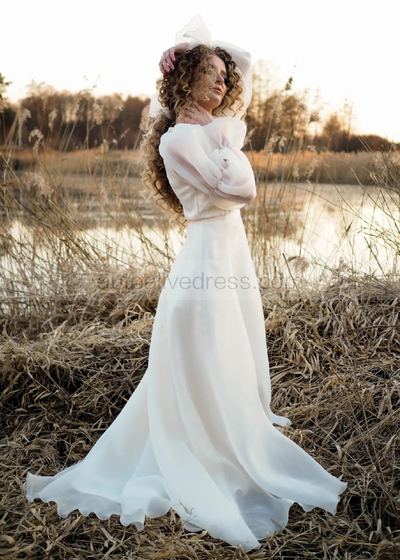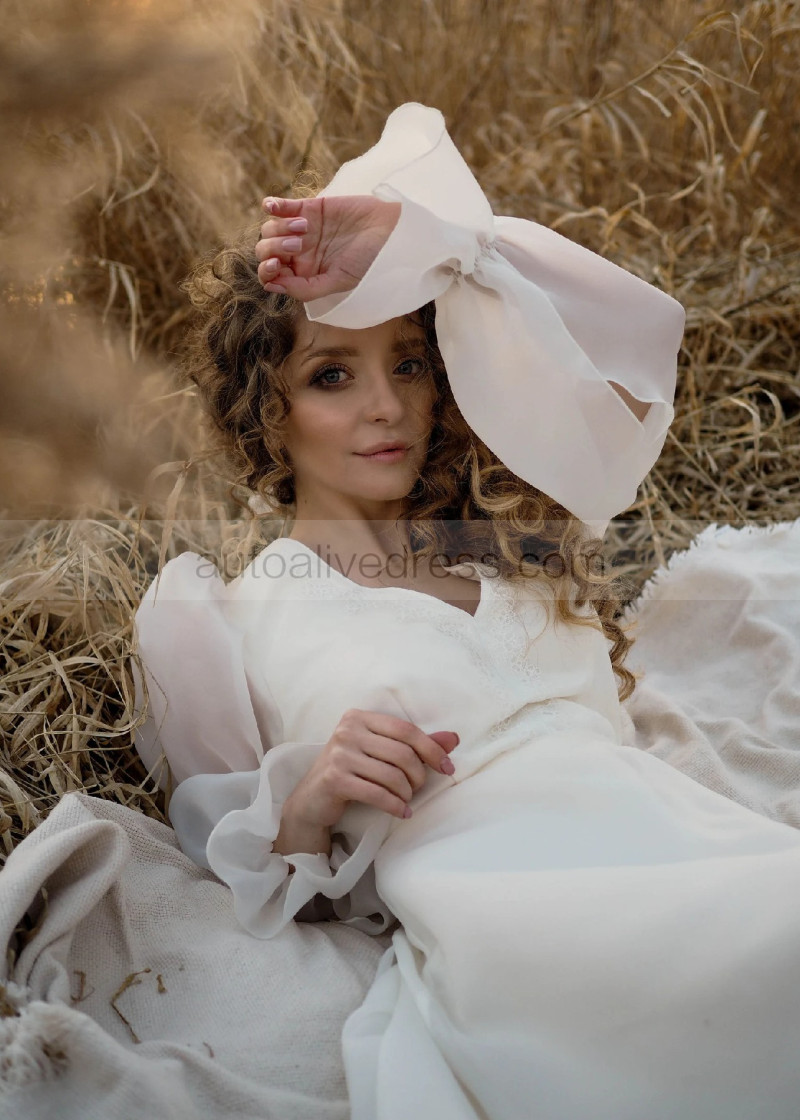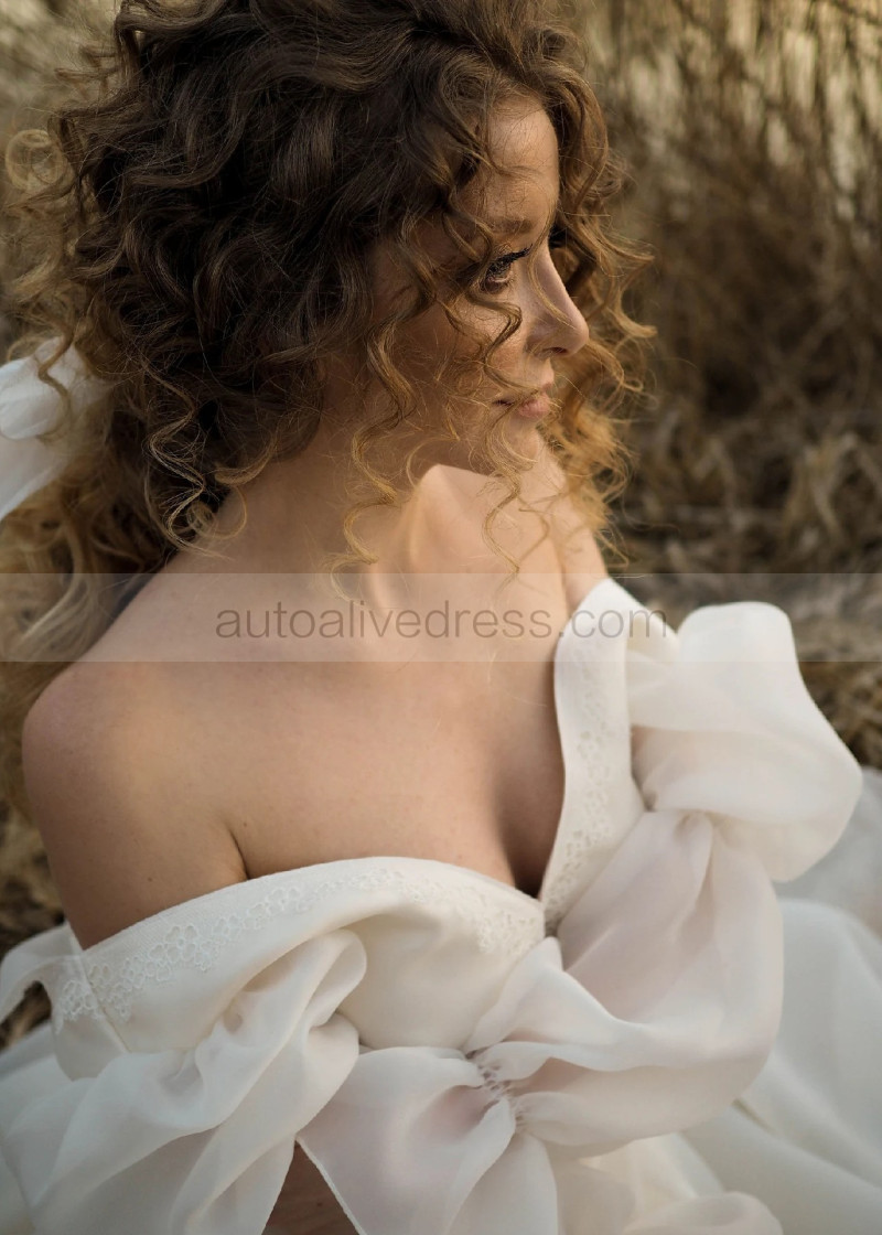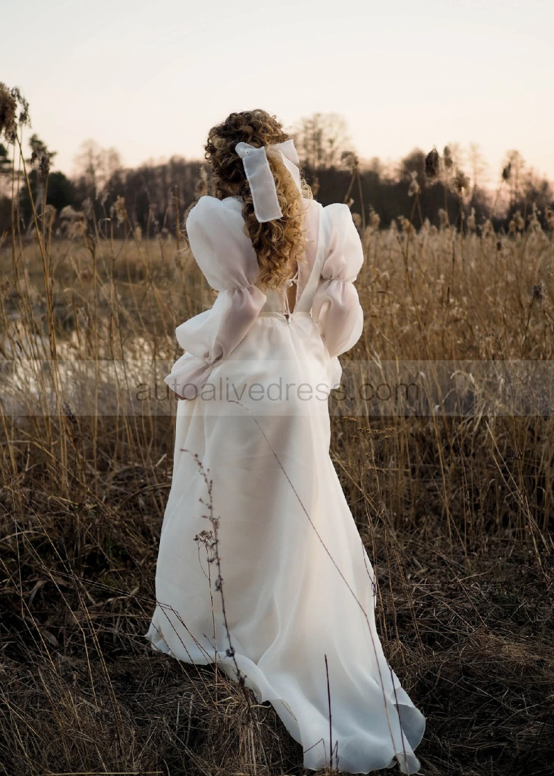 V Neck Ivory Organza Lace Tie Back Airy Wedding Dress