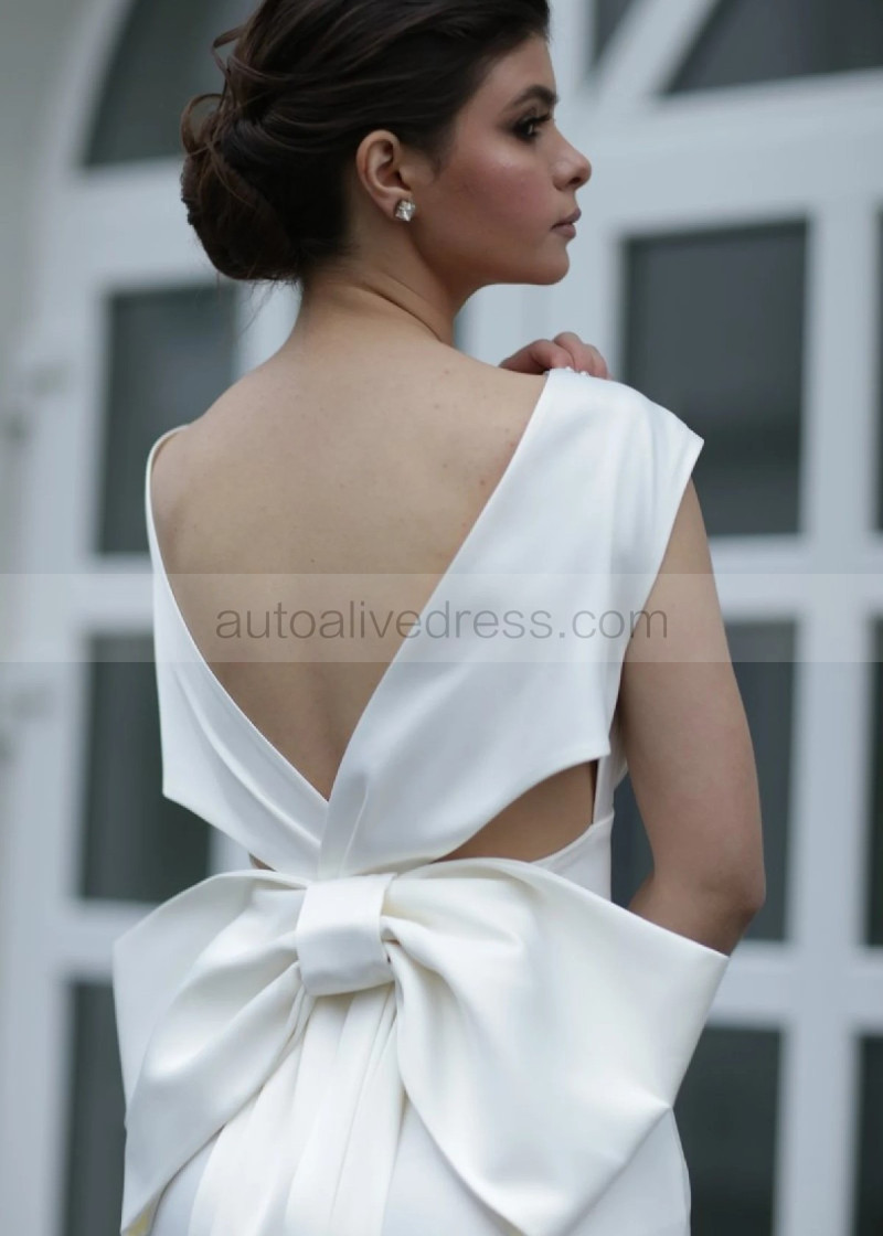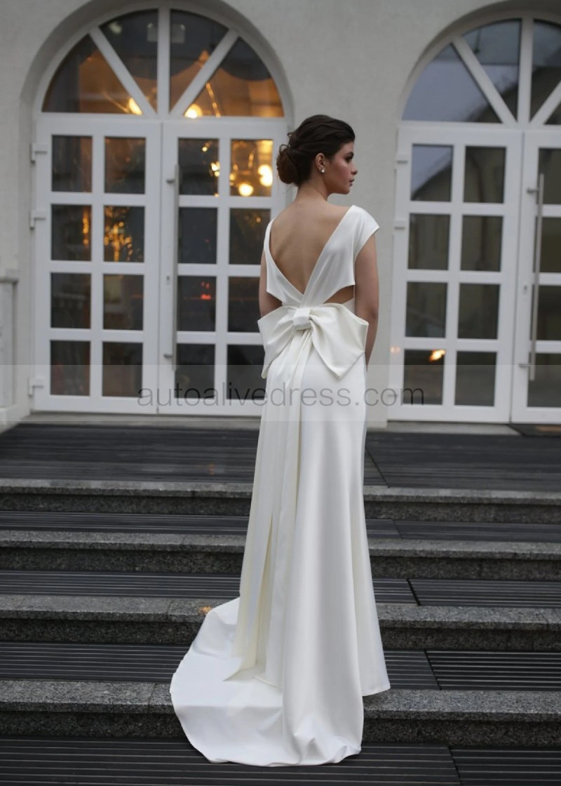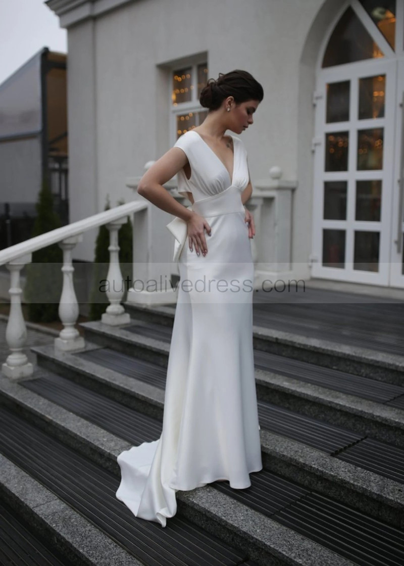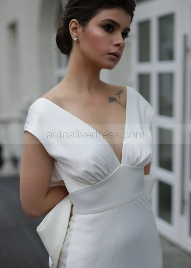 V Neck Ivory Satin Wedding Dress With Big Bow