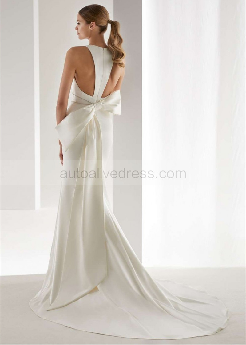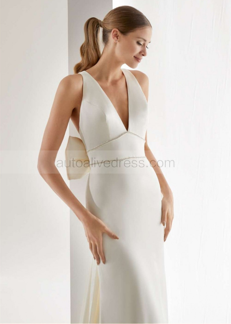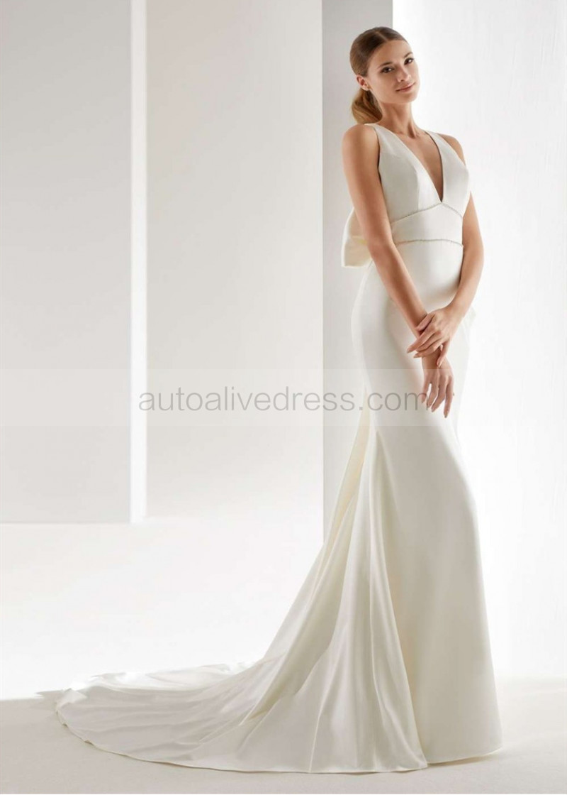 V Neck Ivory Satin Wedding Dress With Oversized Bow
