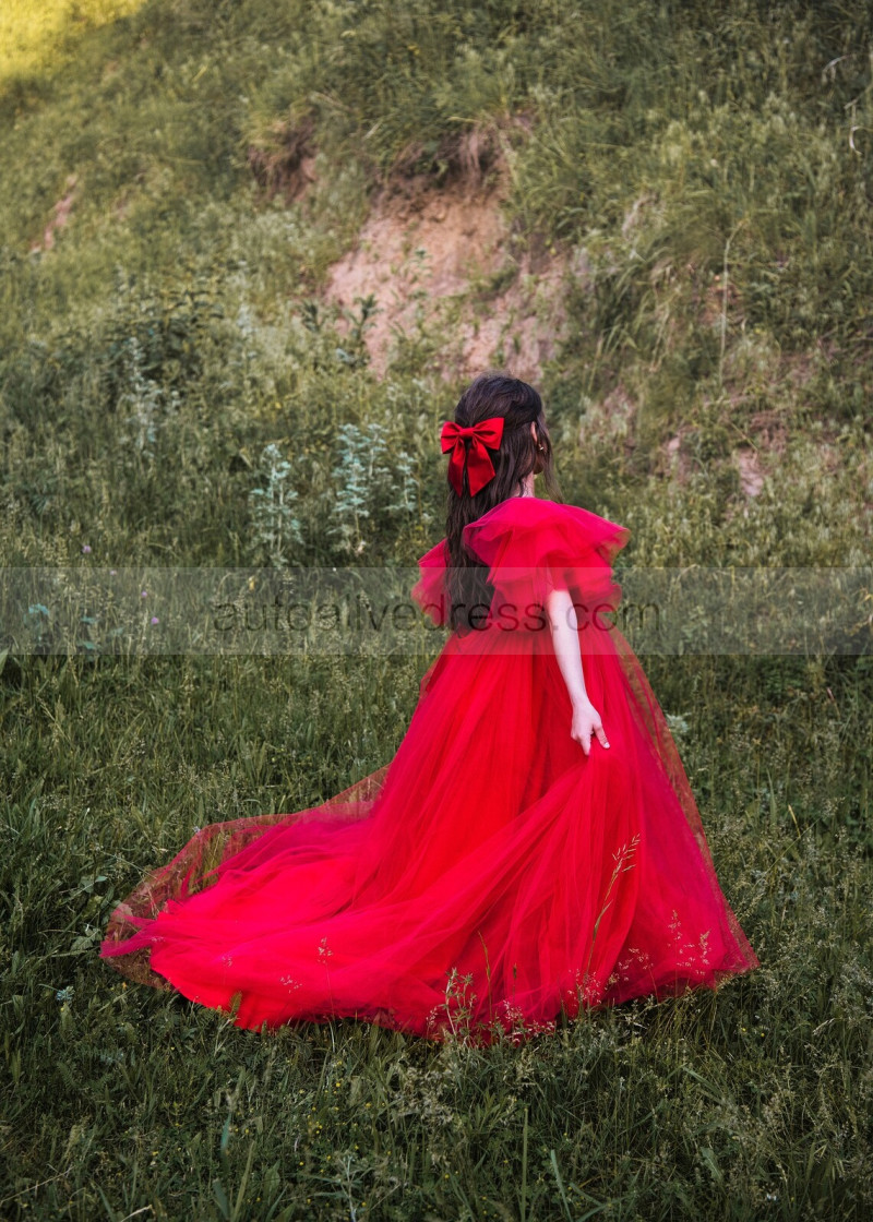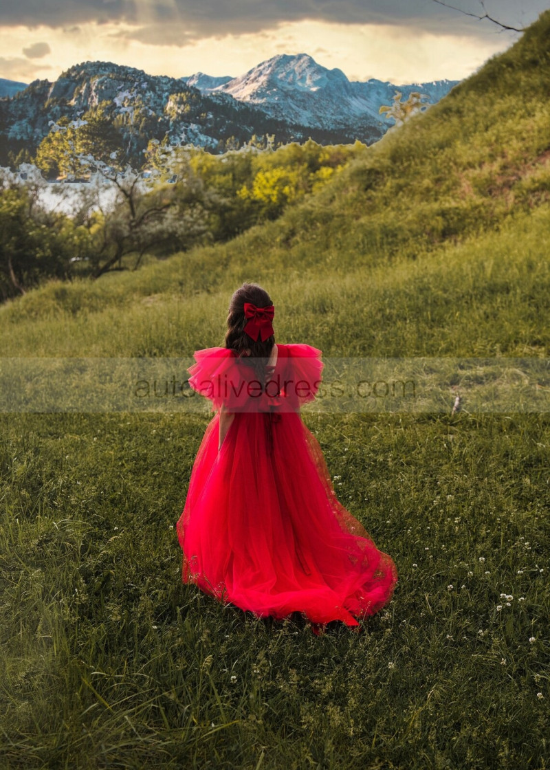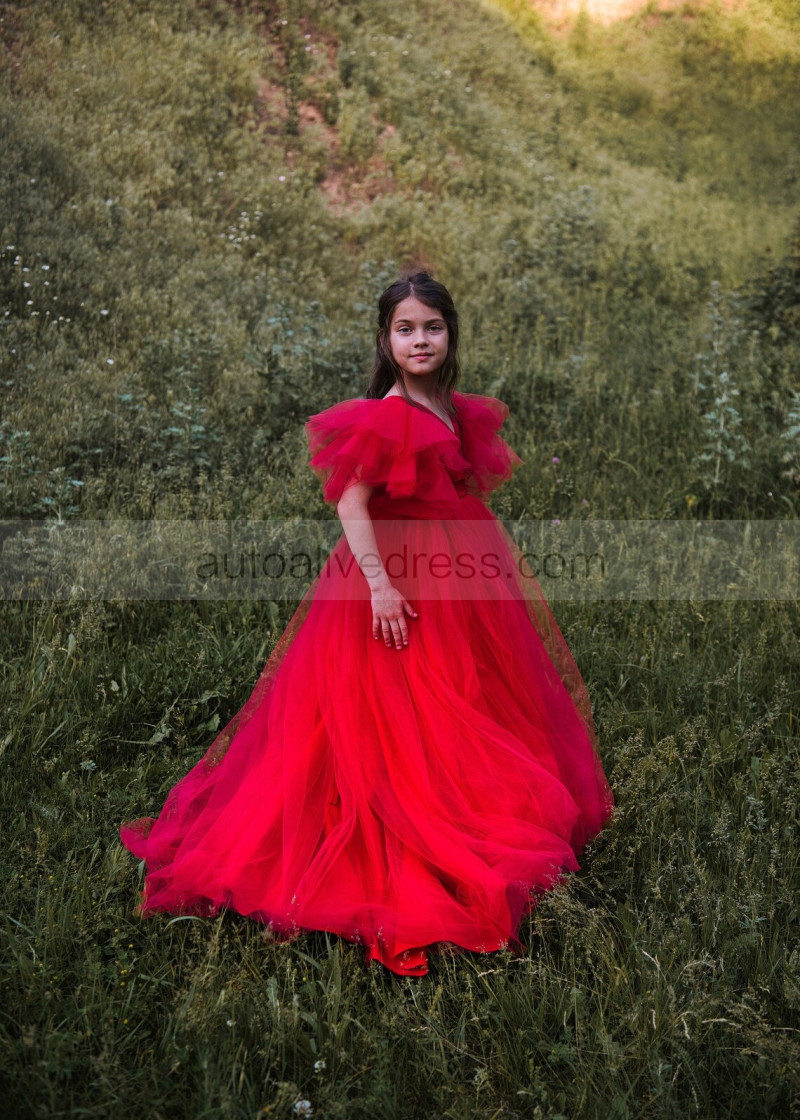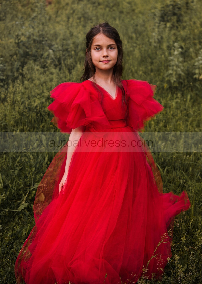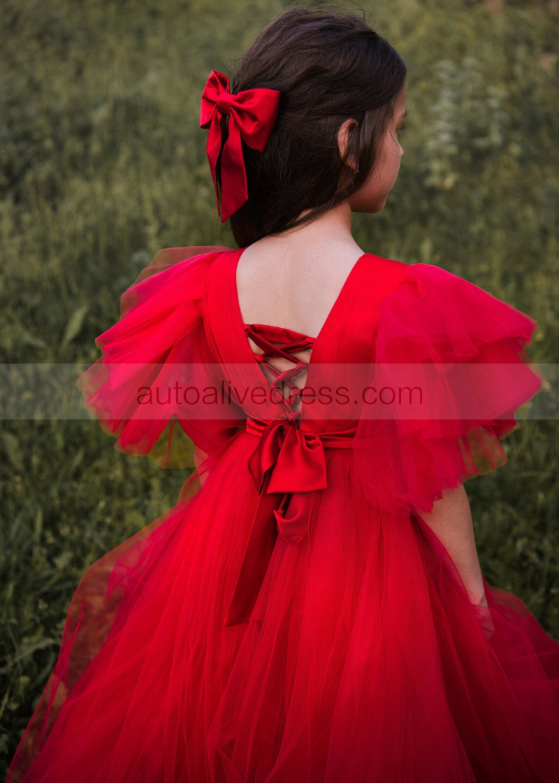 V Neck Red Pleated Tulle Corset Back Flower Girl Dress