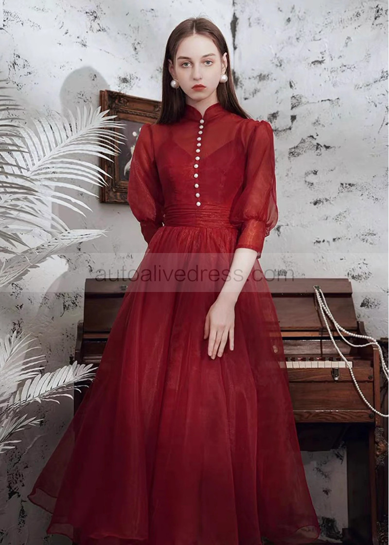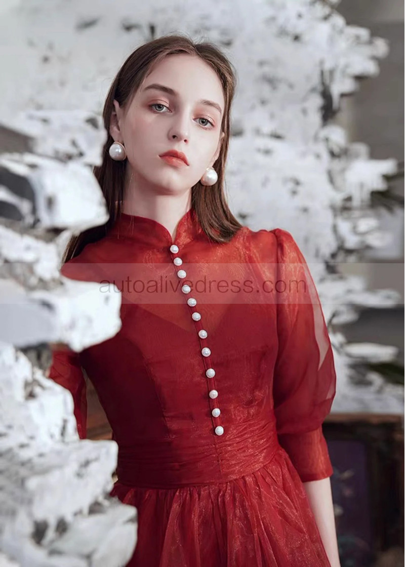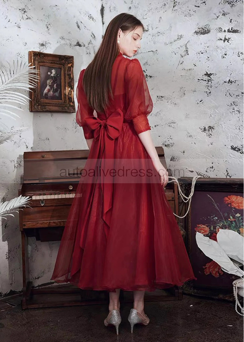 Vintage High Neck Red Organza Tea Length Prom Dress