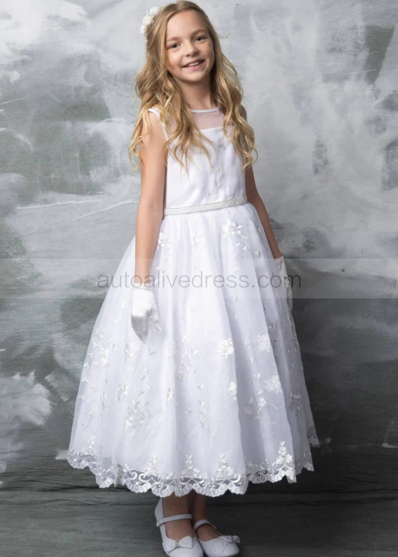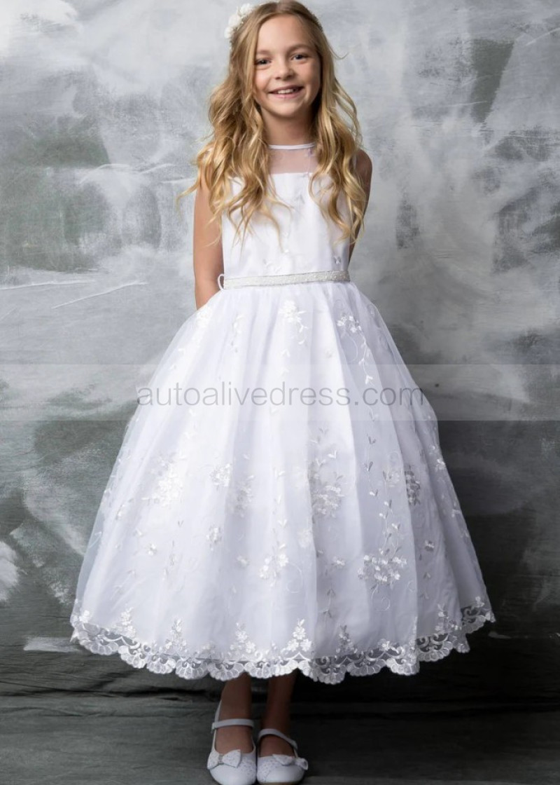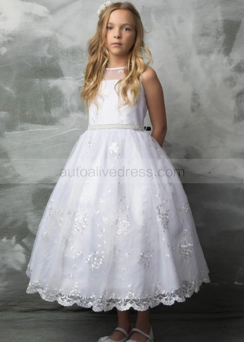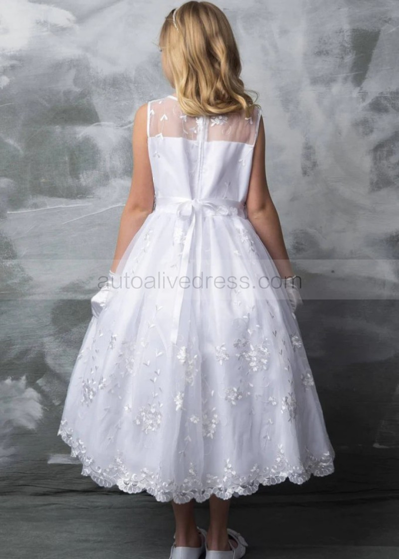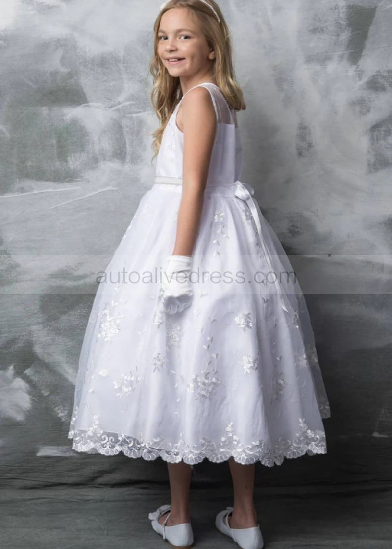 White Embroidered Organza Flower Girl Dress Communion Dress