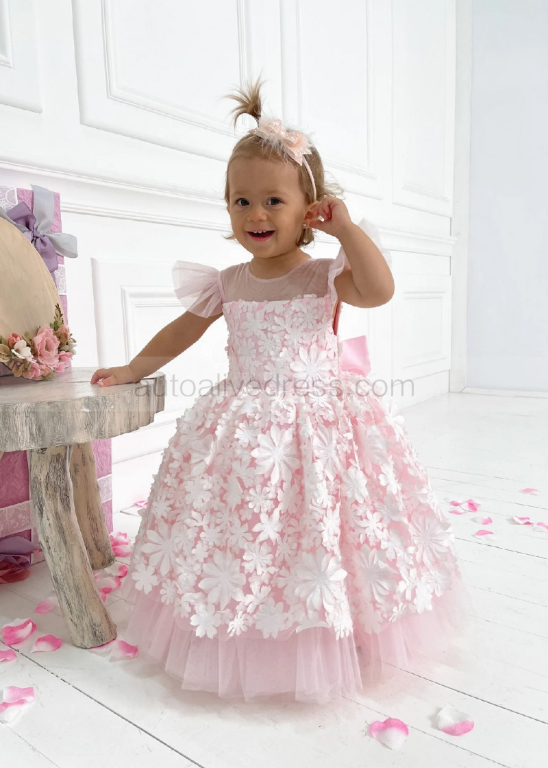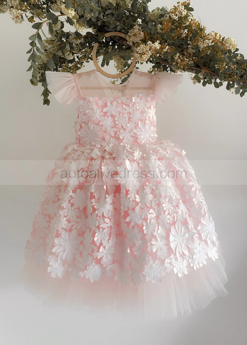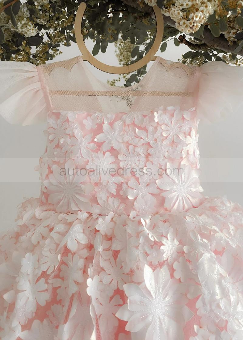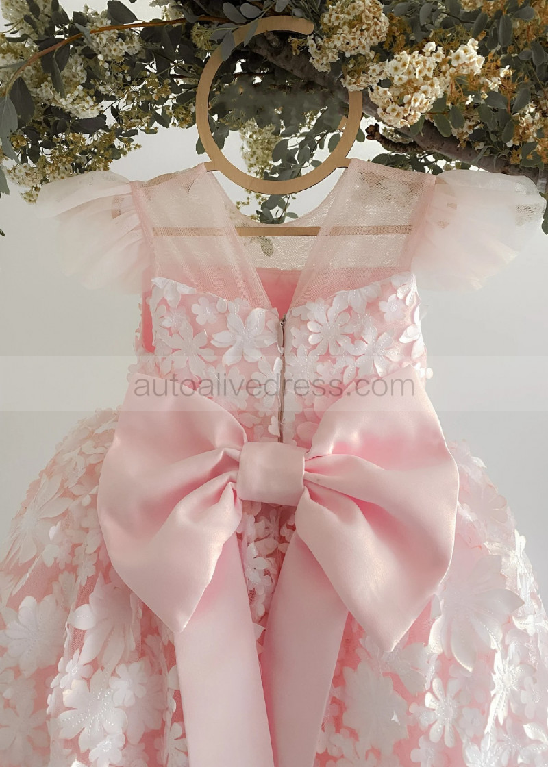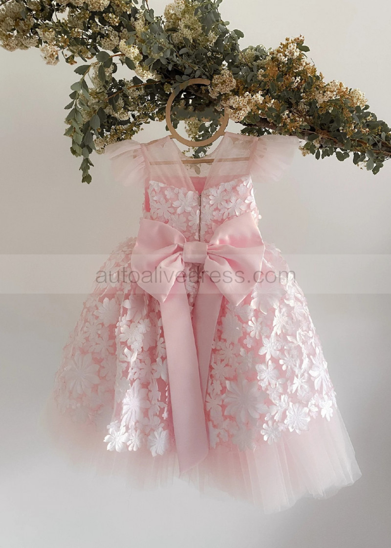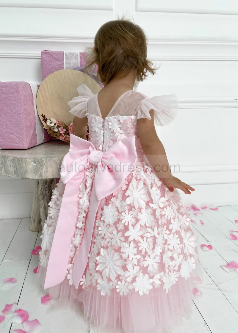 White Floral Appliques Pink Tulle V Back Flower Girl Dress