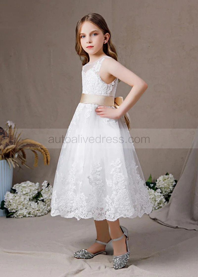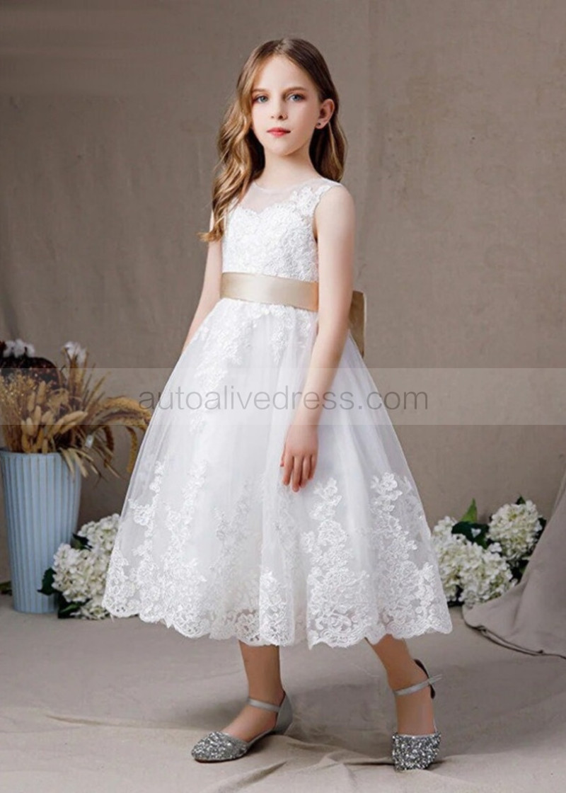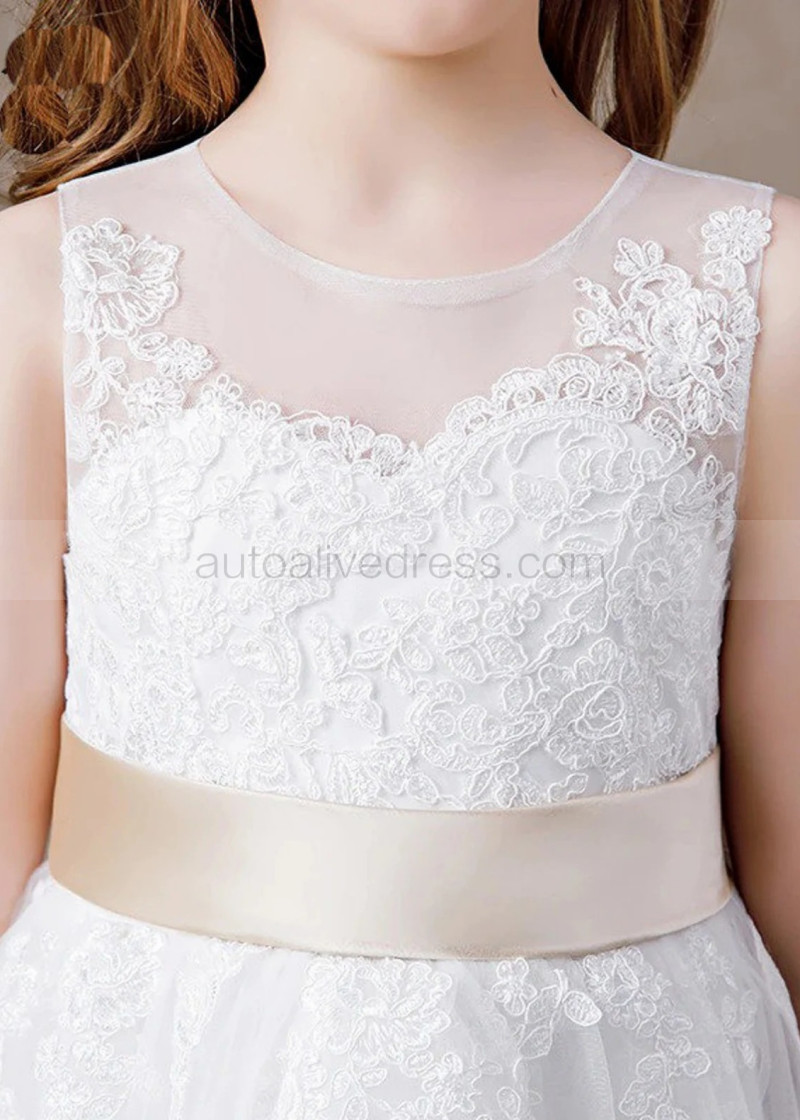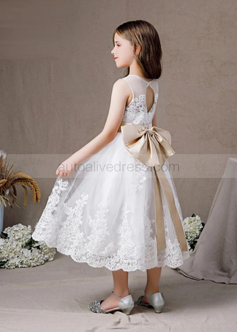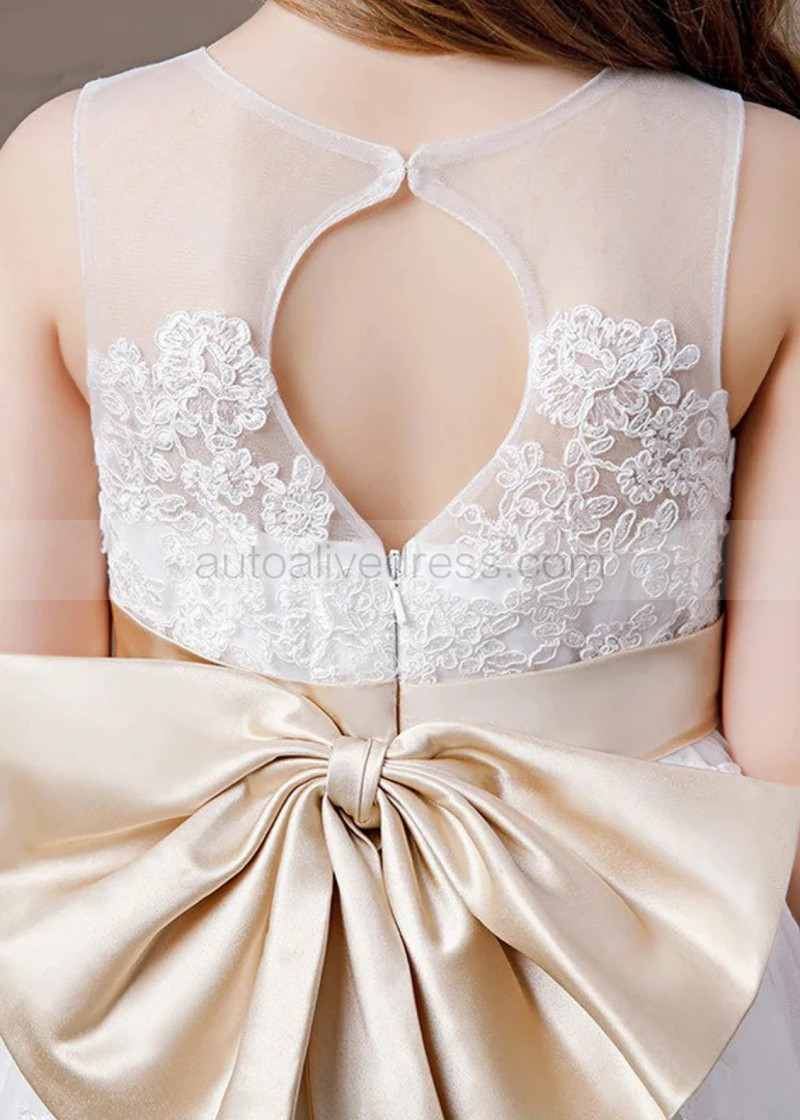 White Lace Tulle Keyhole Back Flower Girl Dress