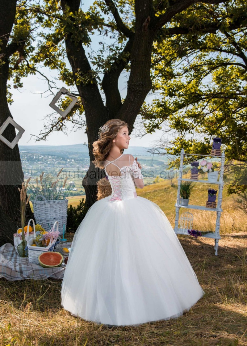 White Lace Tulle Keyhole Back Romantic Flower Girl Dress
