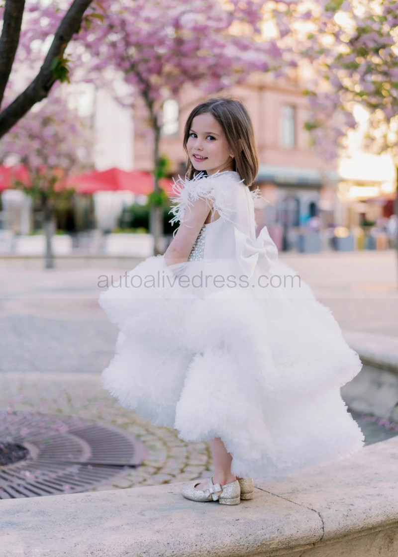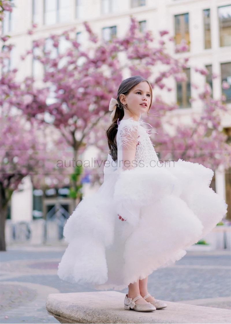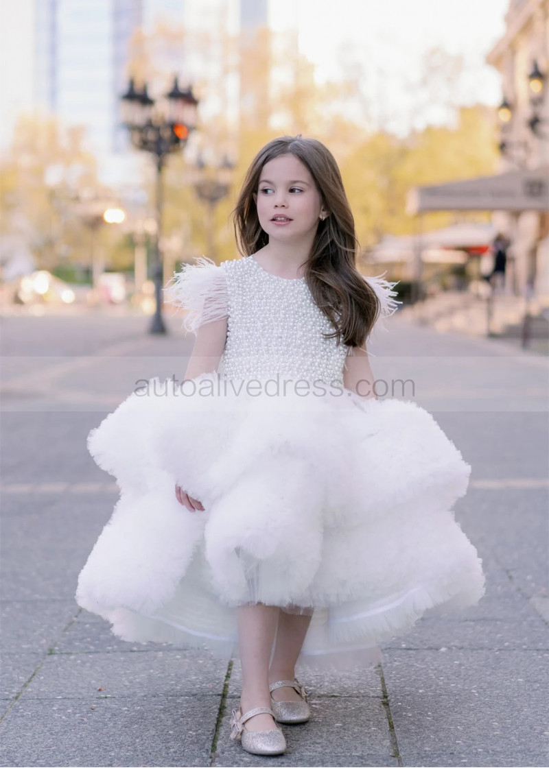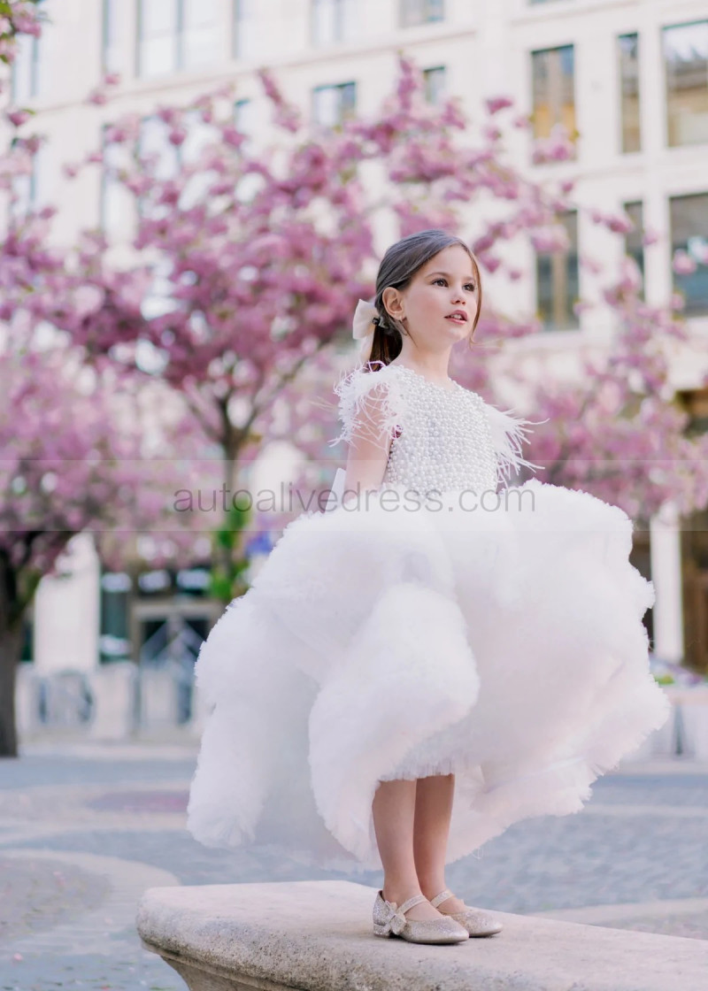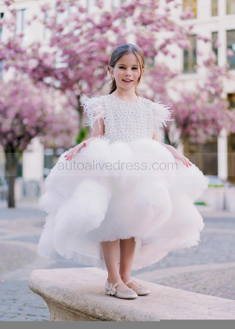 White Pearl Ruffles Tulle Luxury Flower Girl Dress