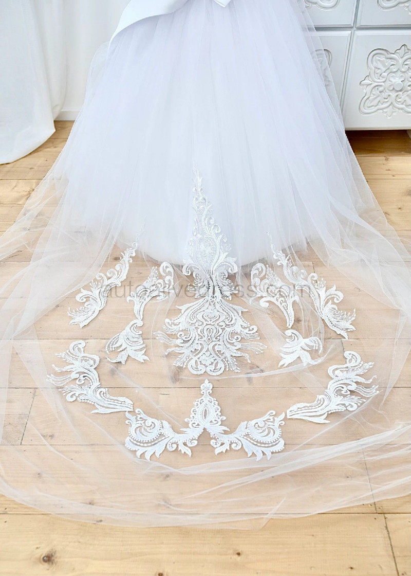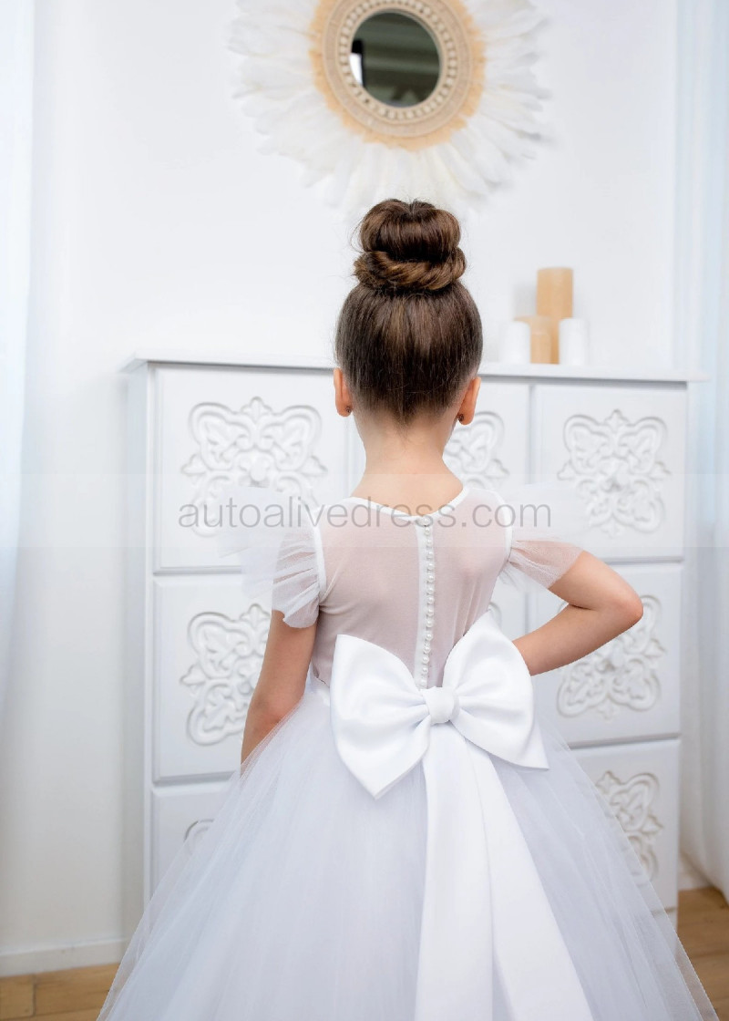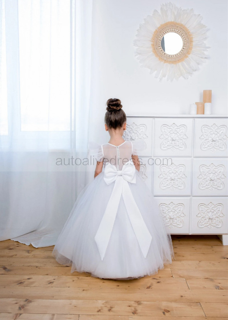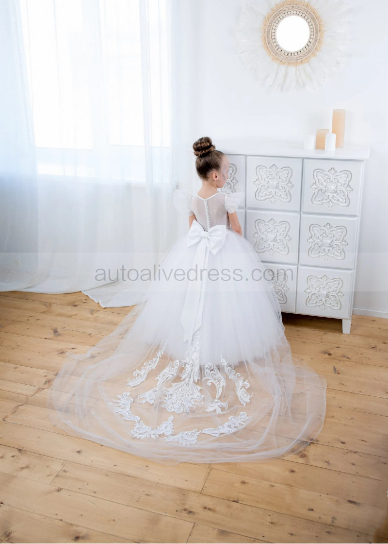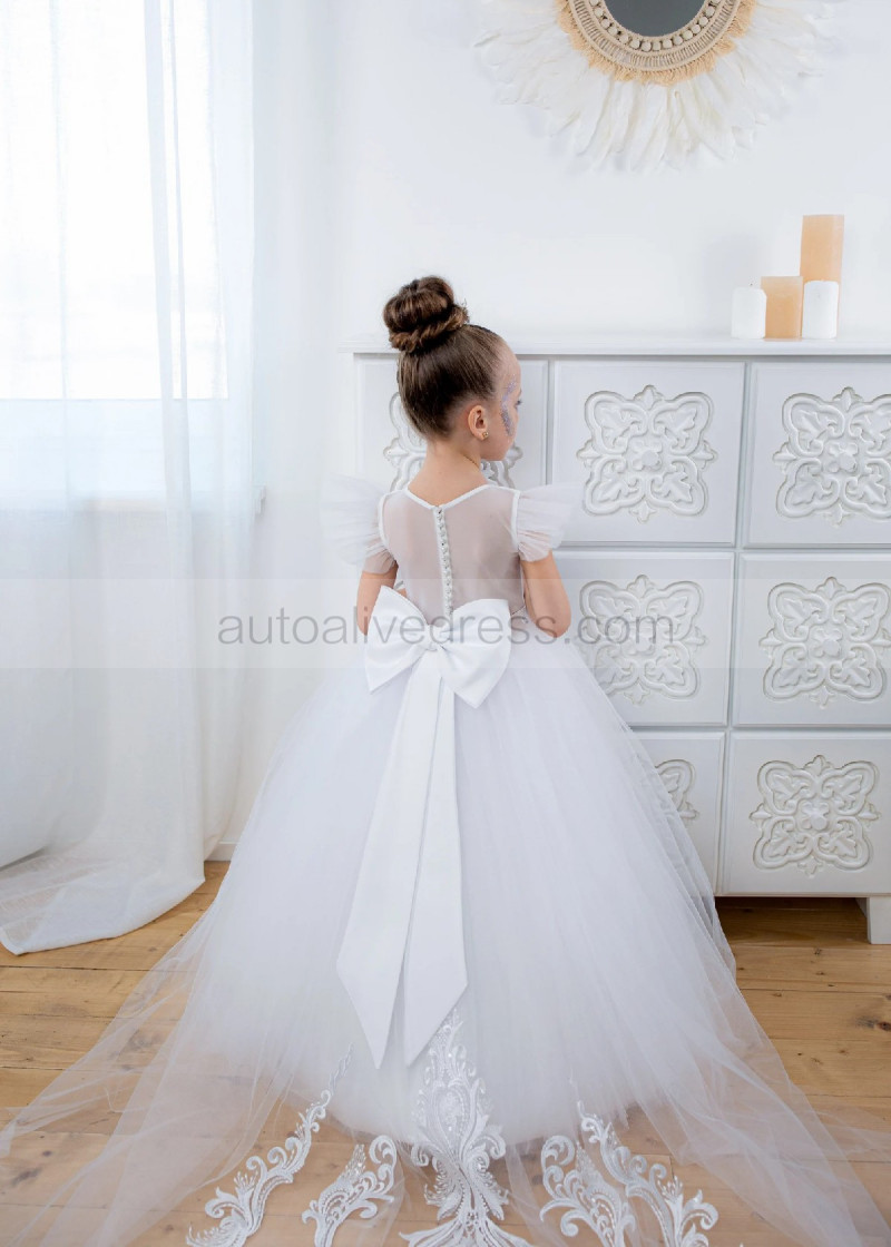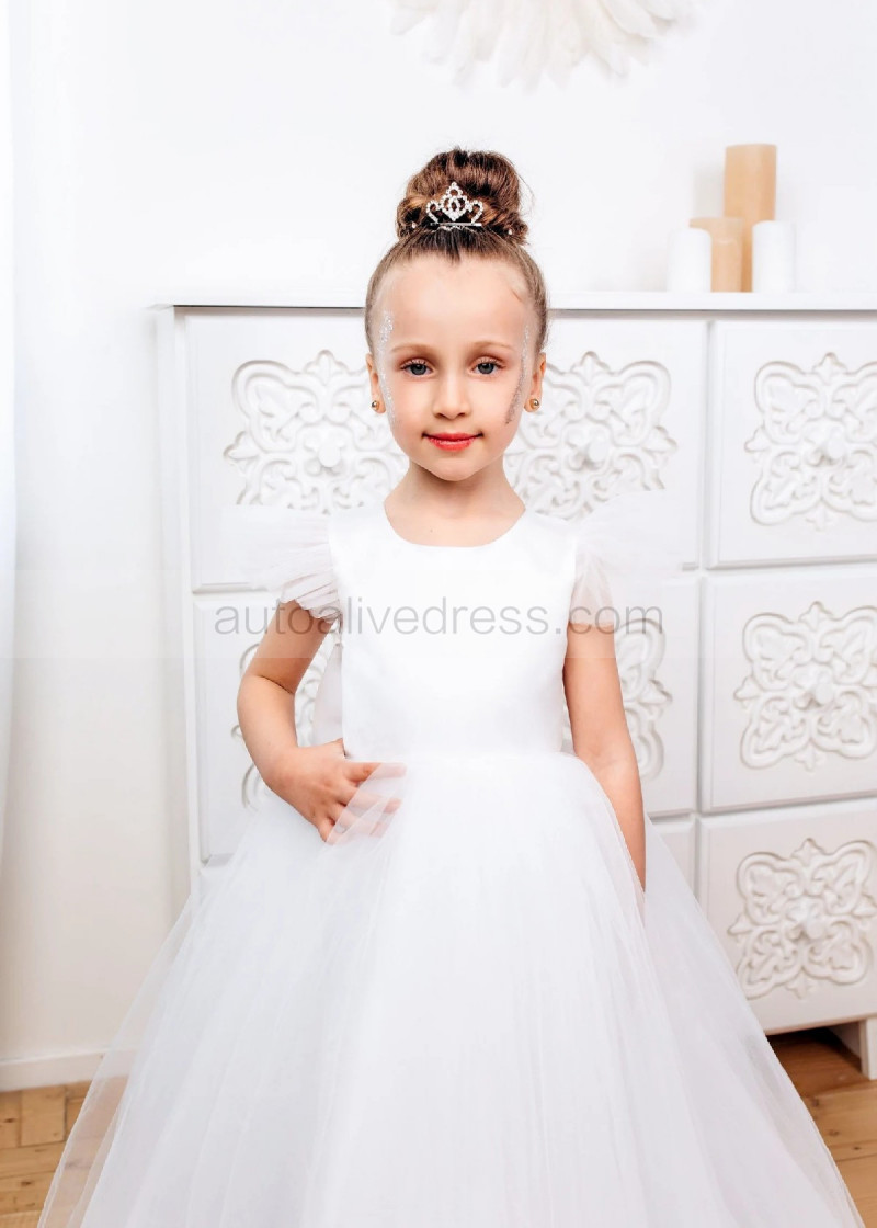 White Satin Tulle Flower Girl Dress With Removable Lace Train