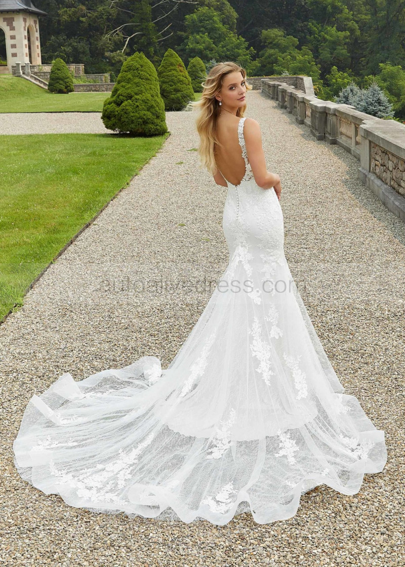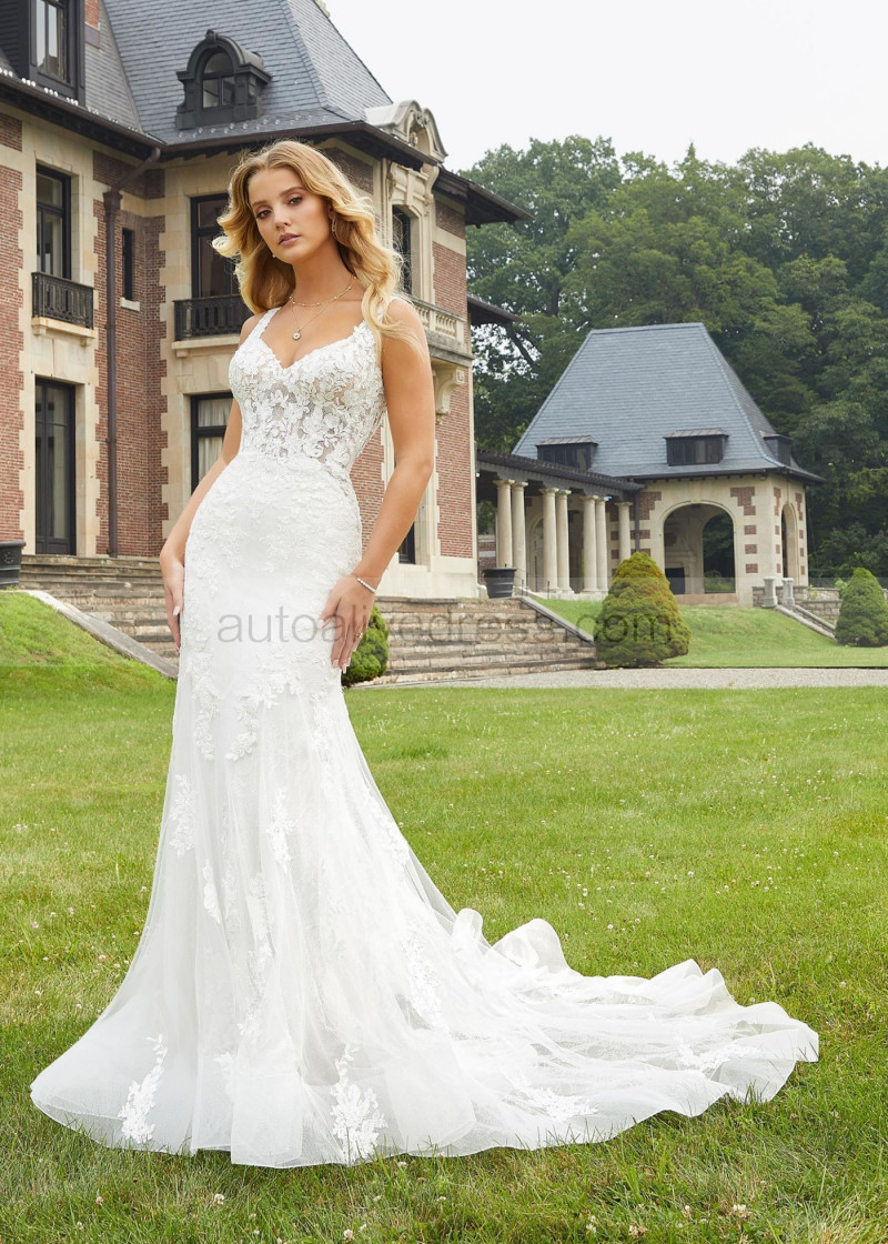 Wide Straps Ivory Lace Tulle Deep V Back Wedding Dress