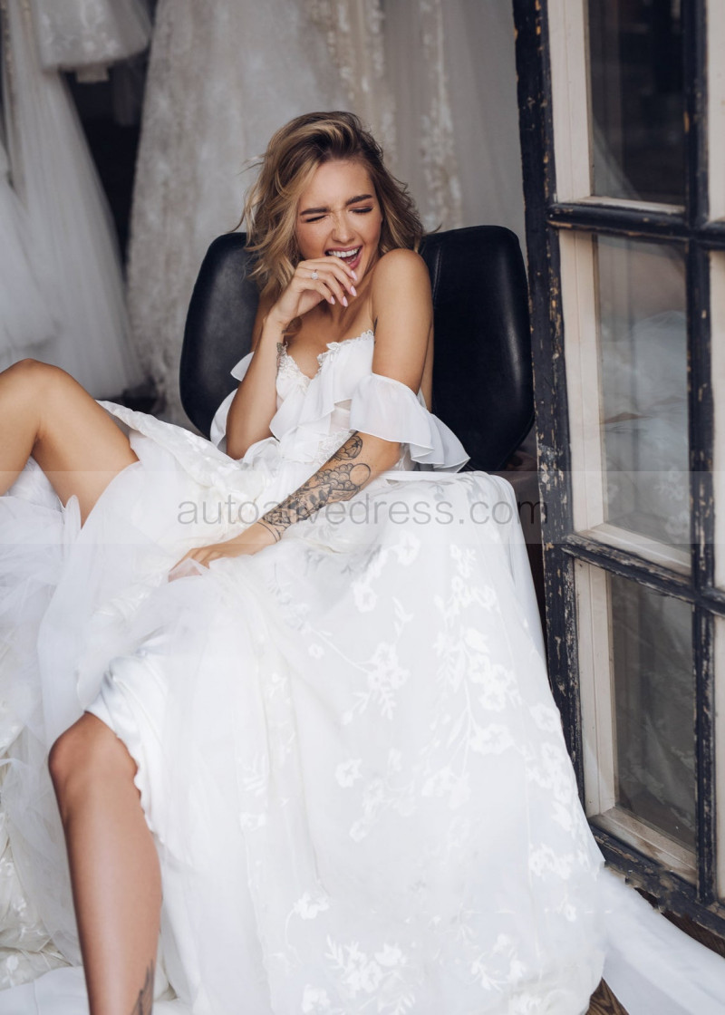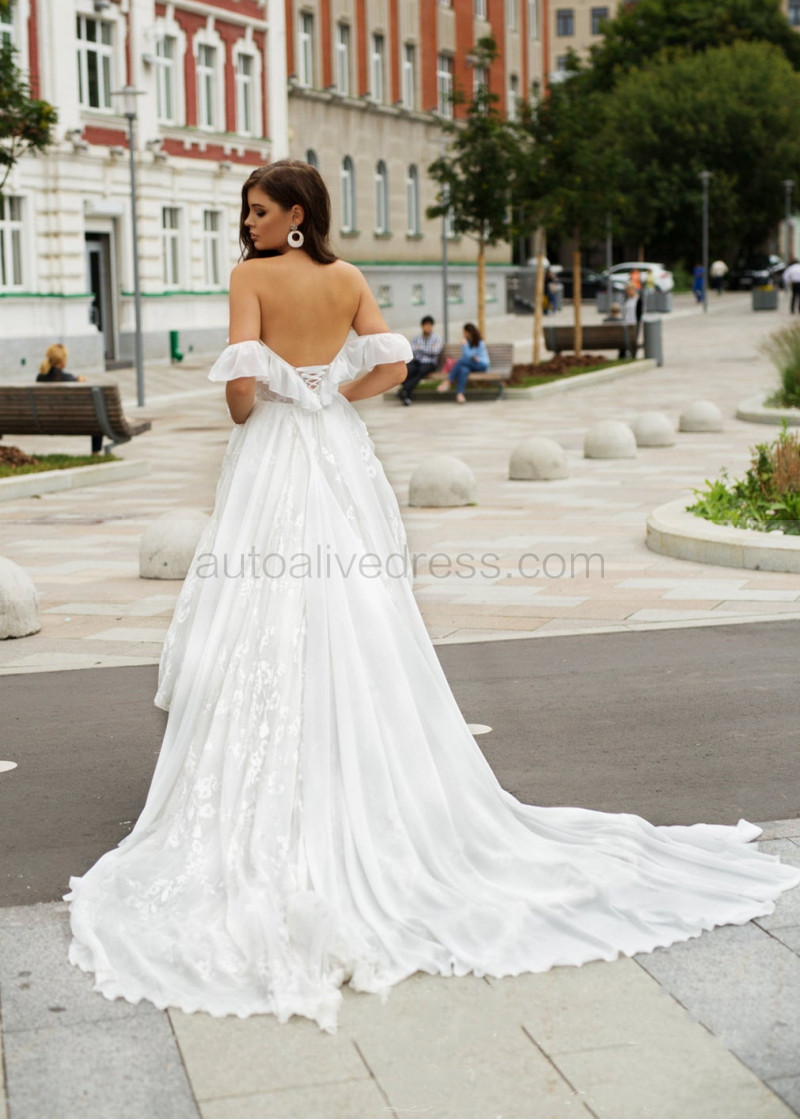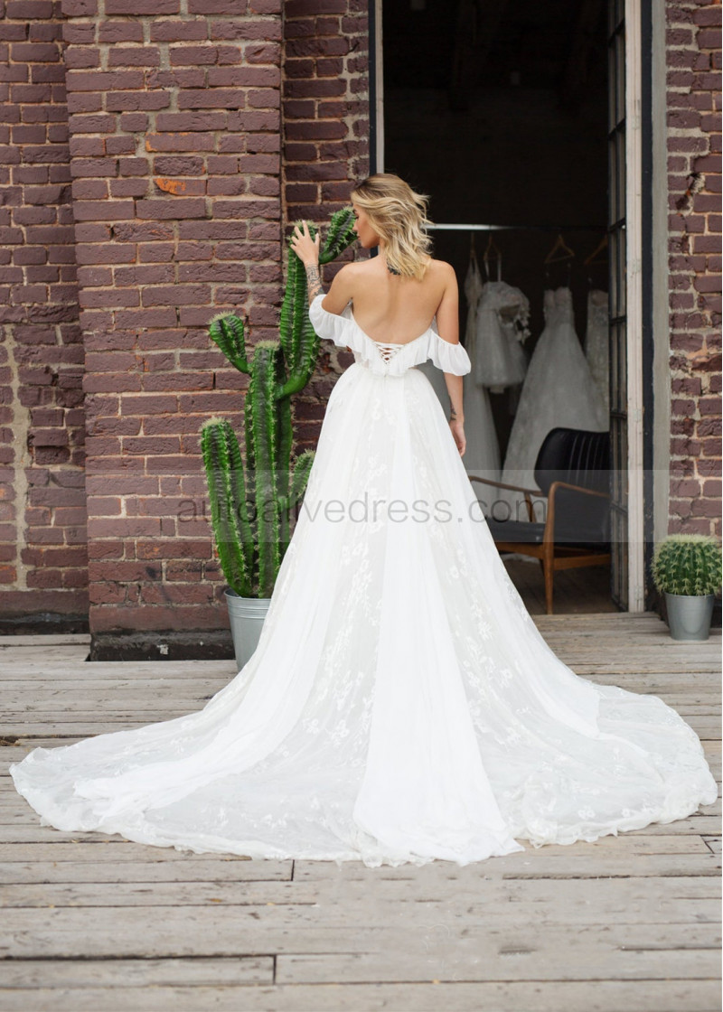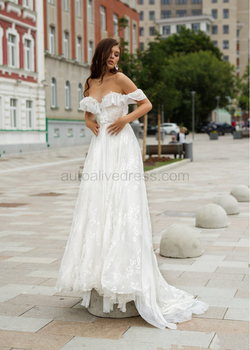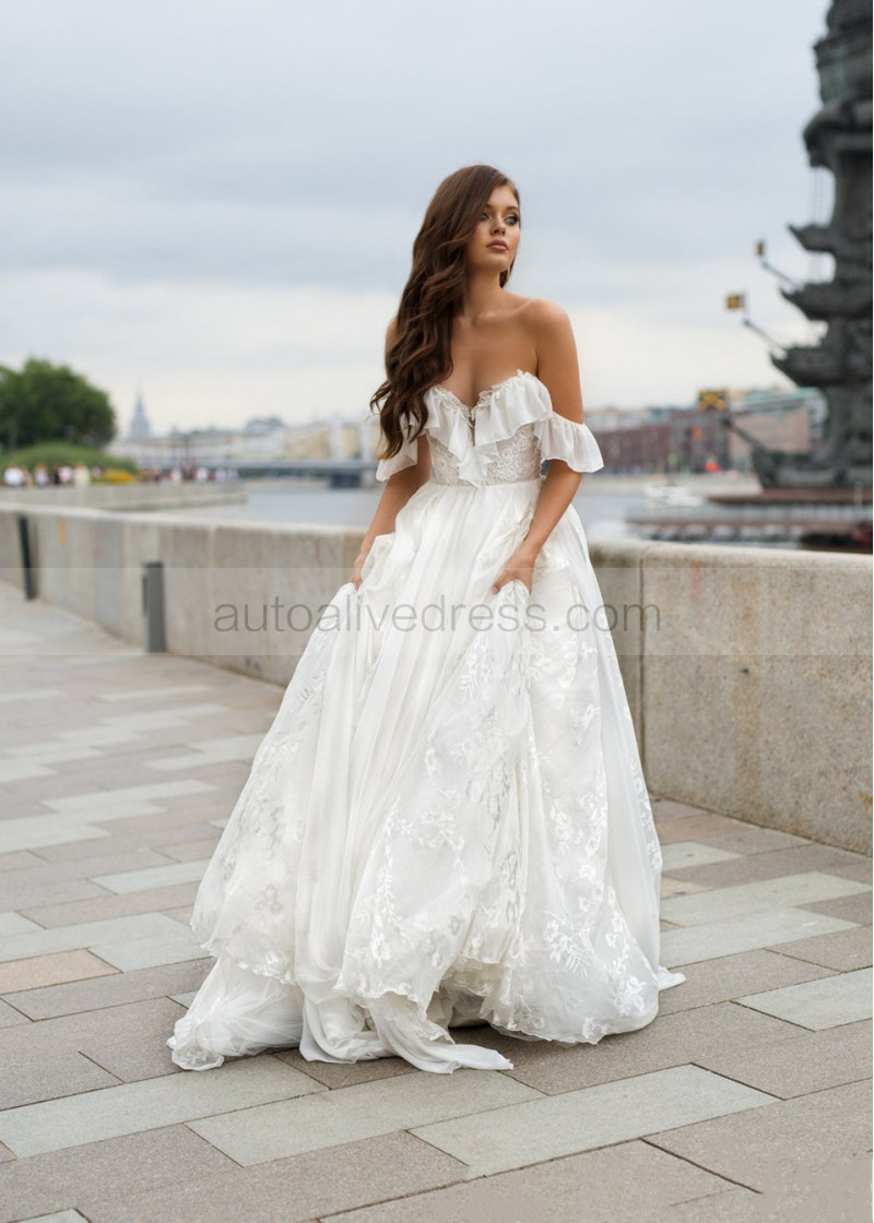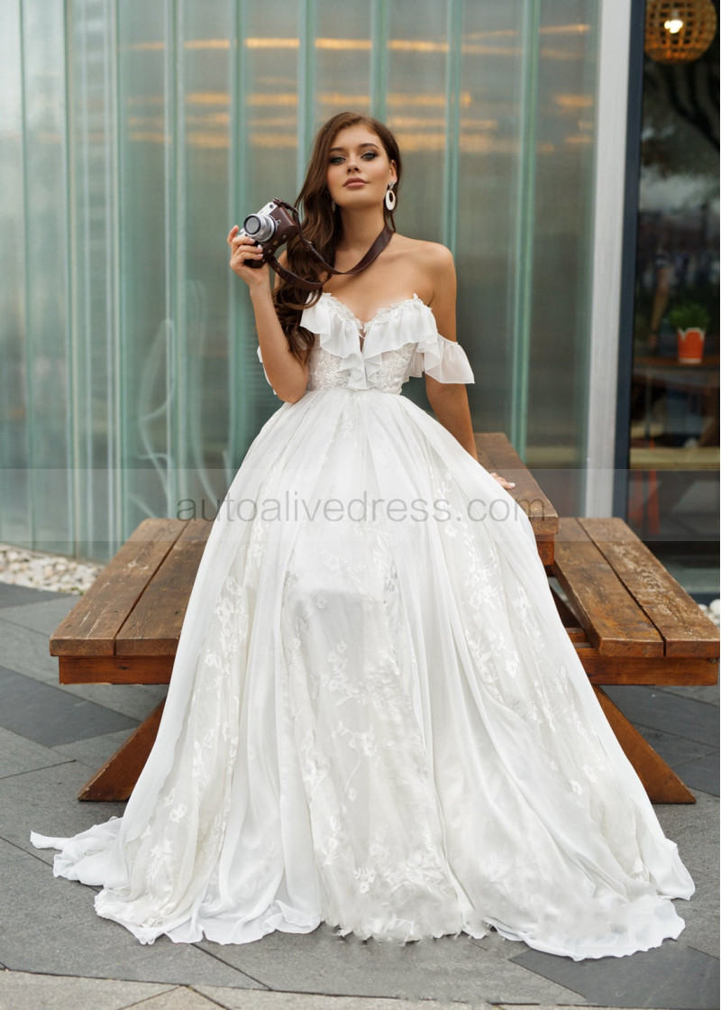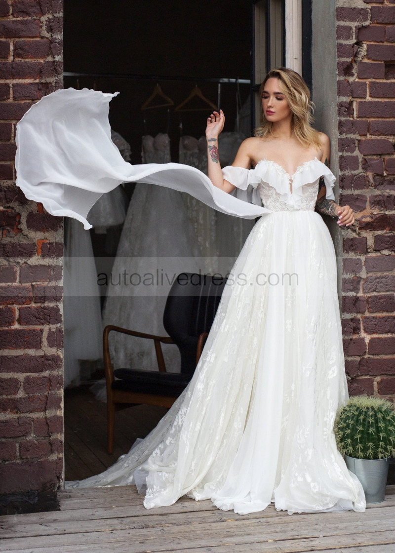Off Shoulder Ivory Lace Chiffon Airy Wedding Dress