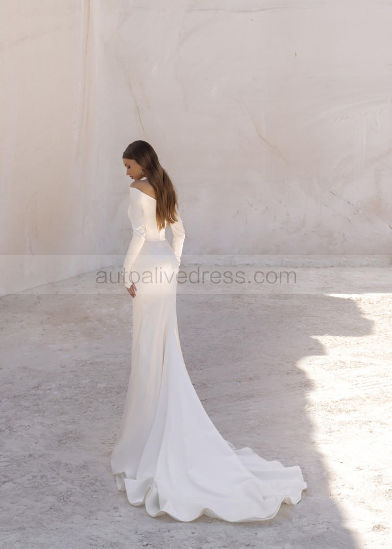Off Shoulder Long Sleeves Ivory Satin Modest Wedding Dress
