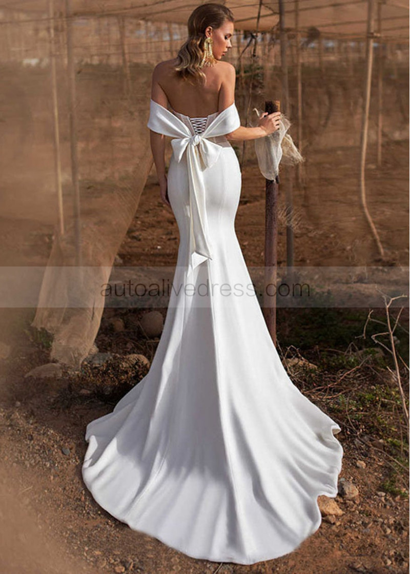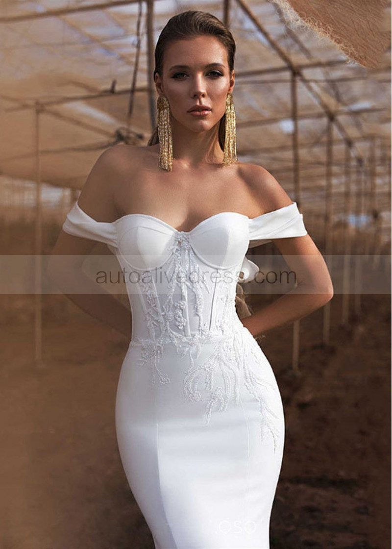 Off Shoulder White Lace Satin Corset Back Wedding Dress