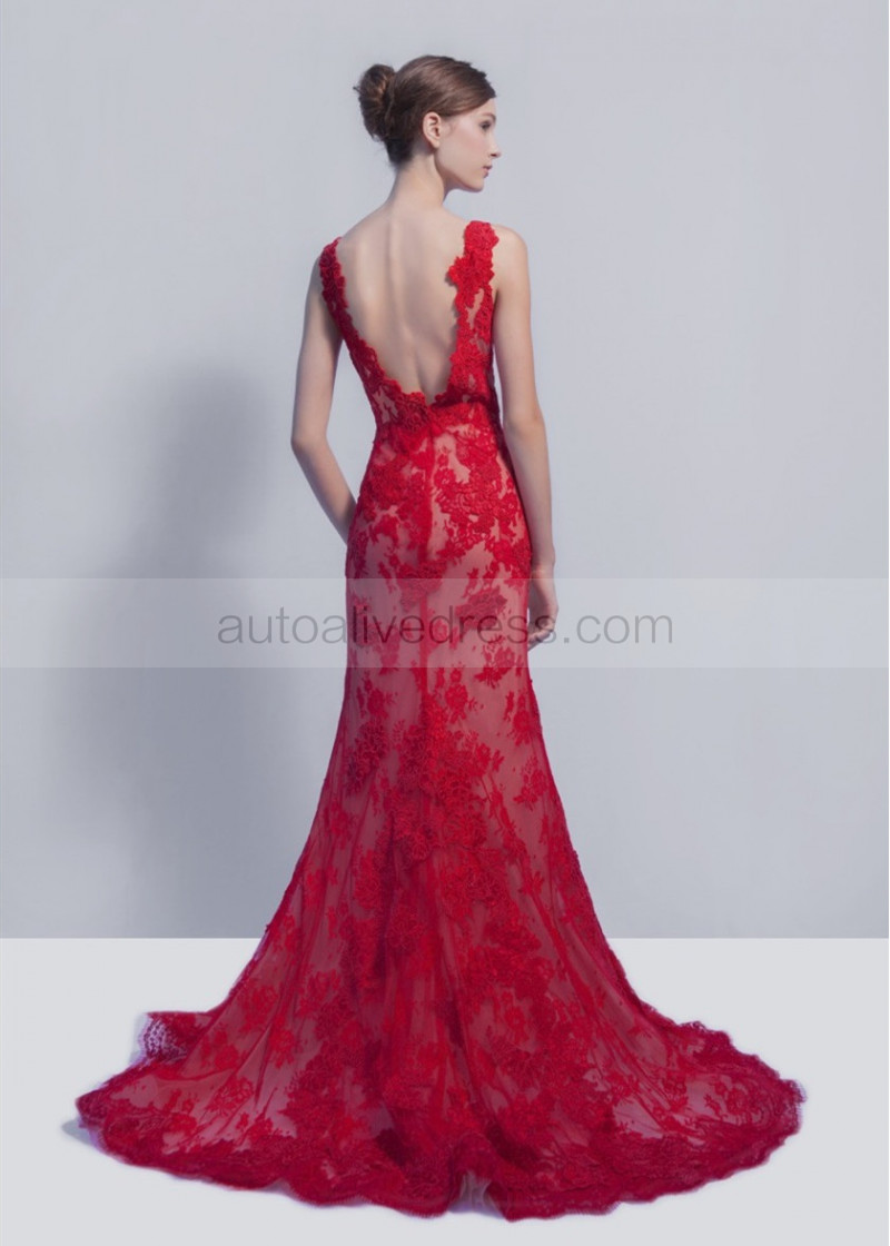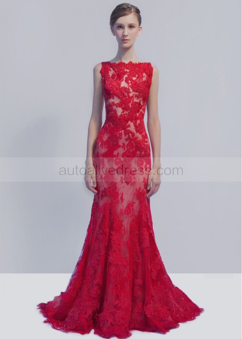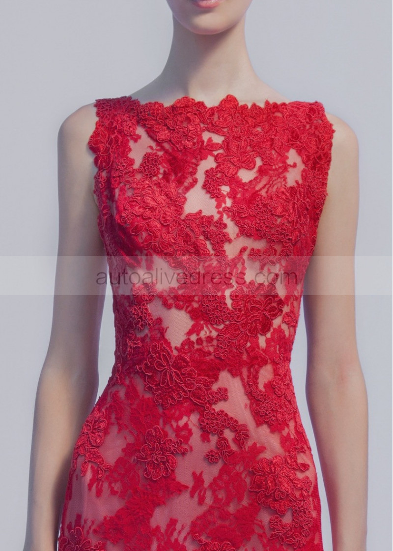 Bateau Neck Red Lace V Back Evening Dress