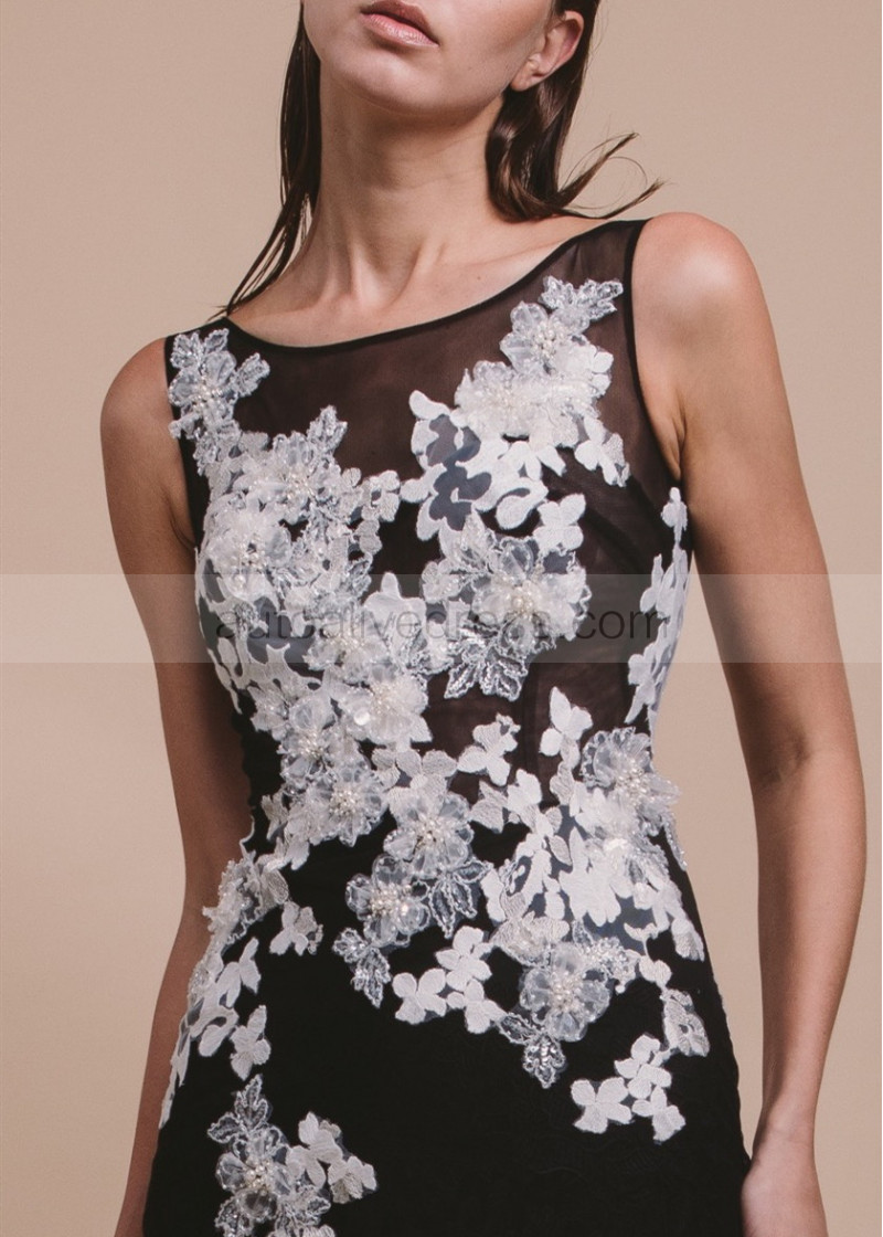 Beaded Ivory Floral Lace Black Tulle Evening Dress