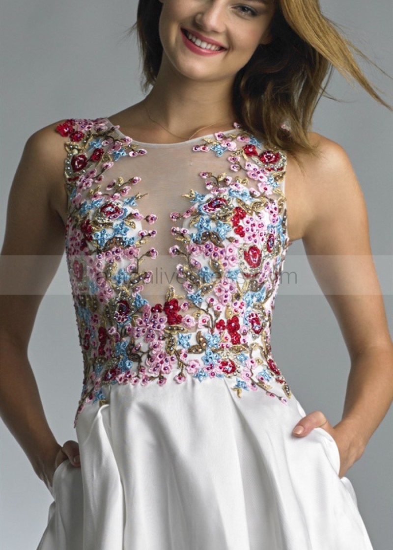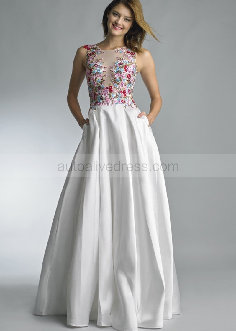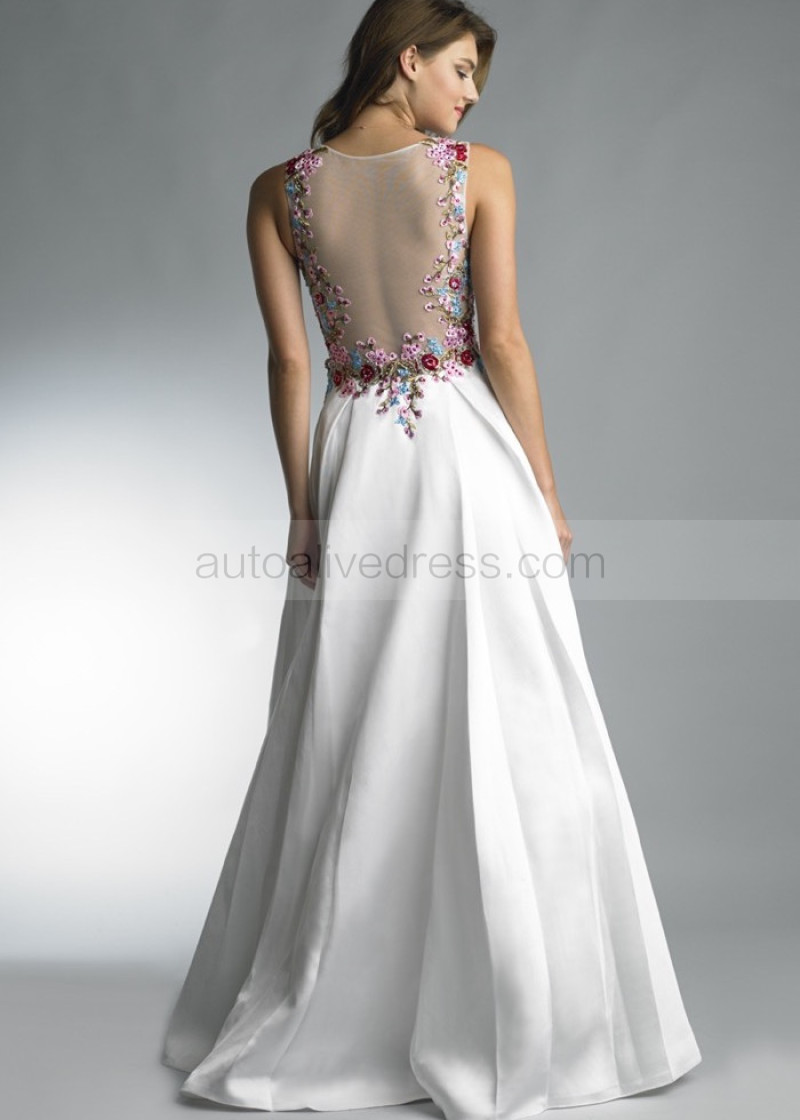 Beaded Multi-colour Flowers Satin Illusion Back Evening Dress