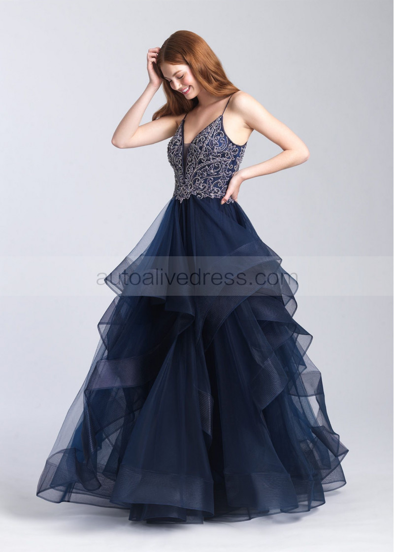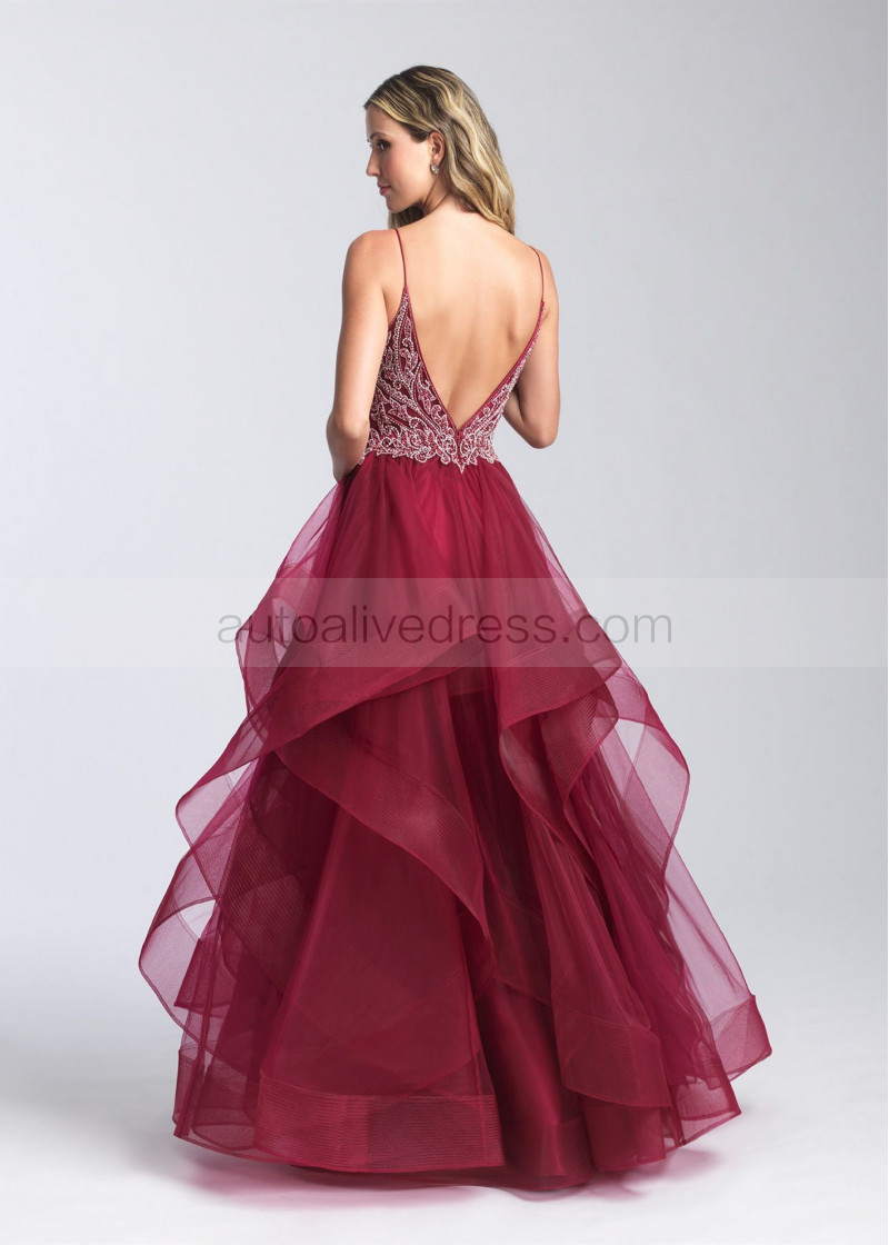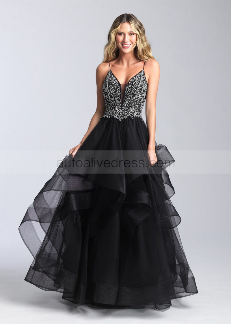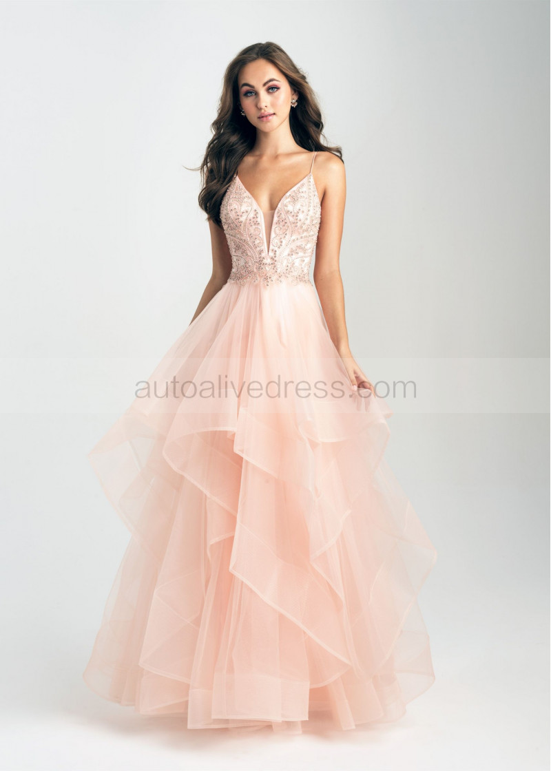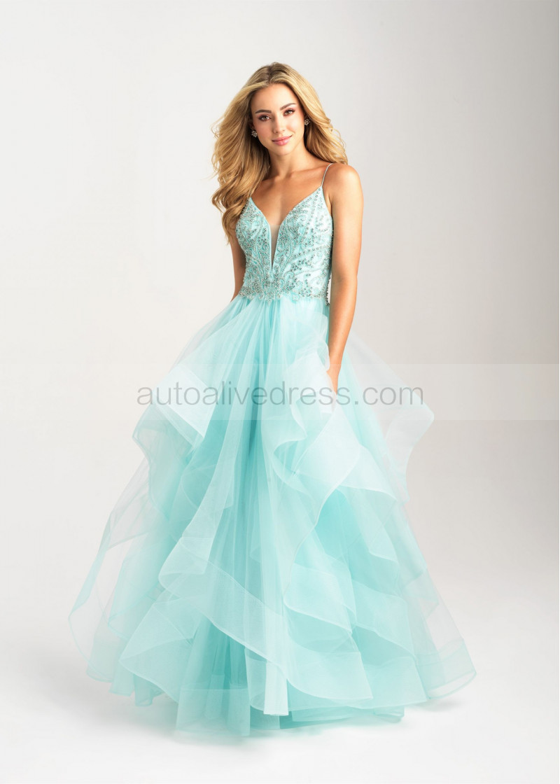 Beaded Tulle V Back Ruffle Long Prom Dress With Horsehair Trim