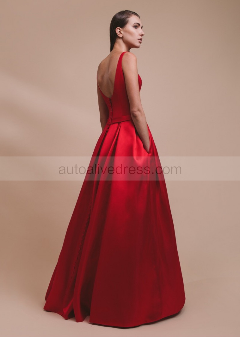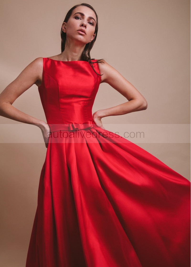 Boat Neck Red Satin V Back Evening Dress With Pockets