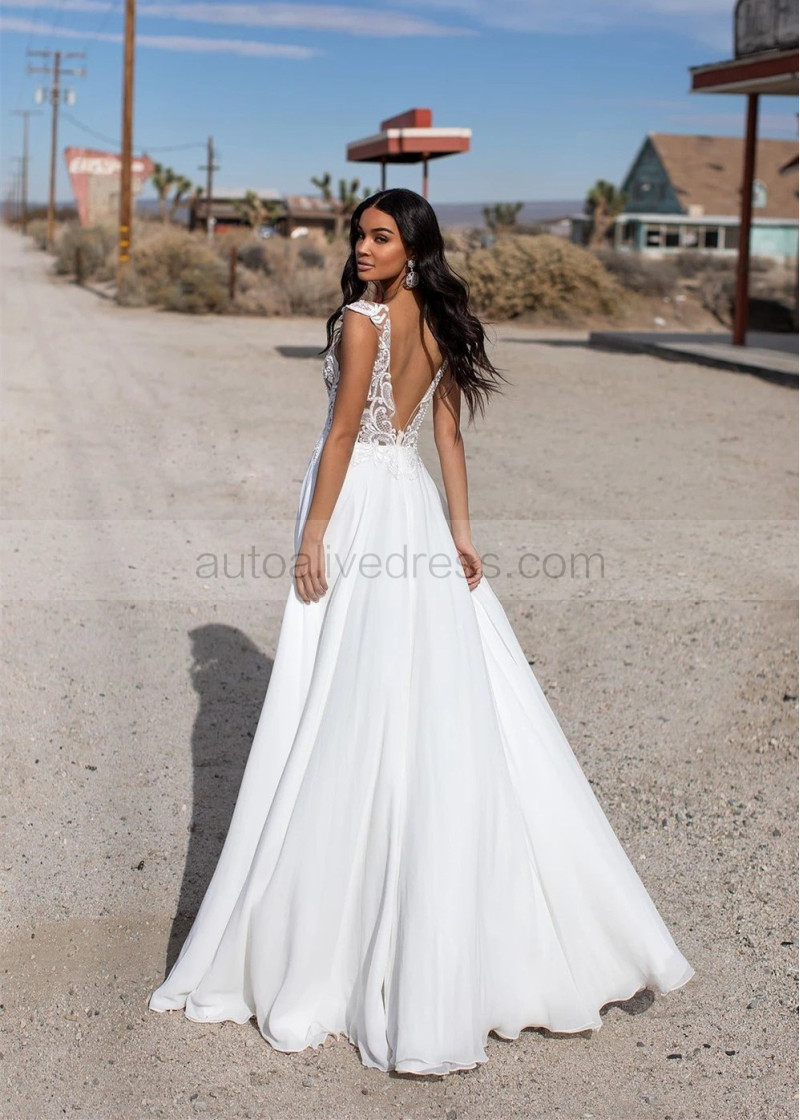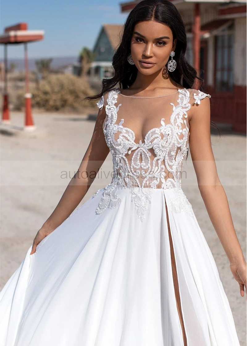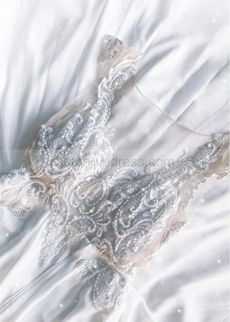 Cap Sleeve White Beaded Lace Chiffon Slit Long Prom Dress