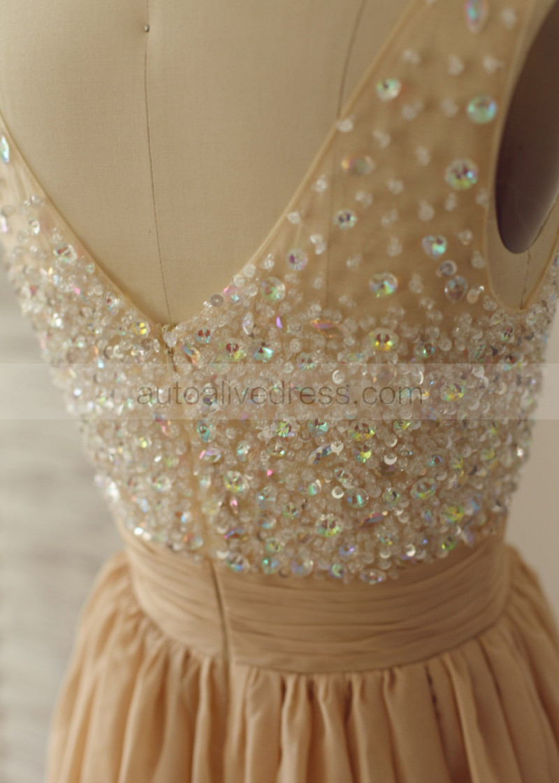 Champagne Chiffon Deep V Neckline Beading Prom Dress