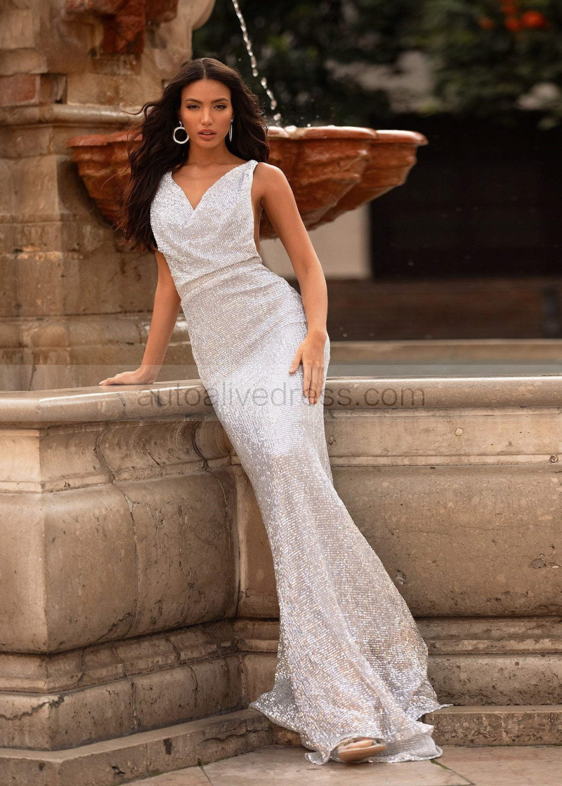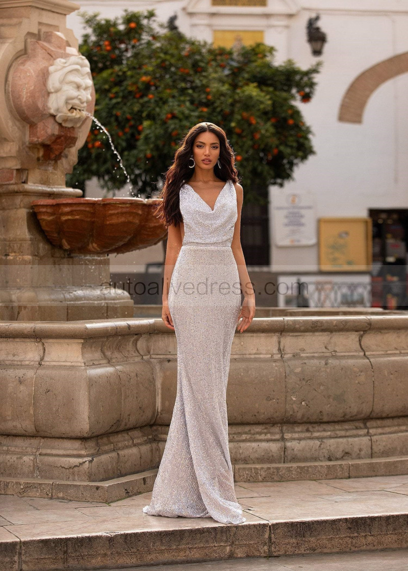 Cowl Neck Silver Sequin Exposed Back Evening Dress