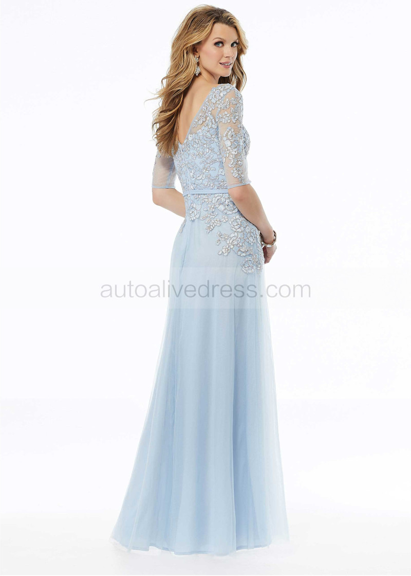 Elbow Sleeves Beaded Sky Blue Lace Tulle Evening Dress