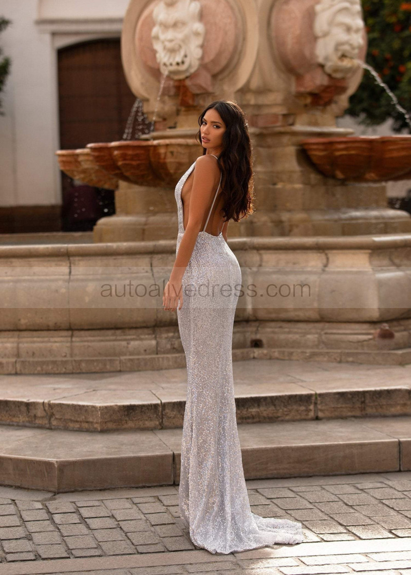 Cowl Neck Silver Sequin Exposed Back Evening Dress