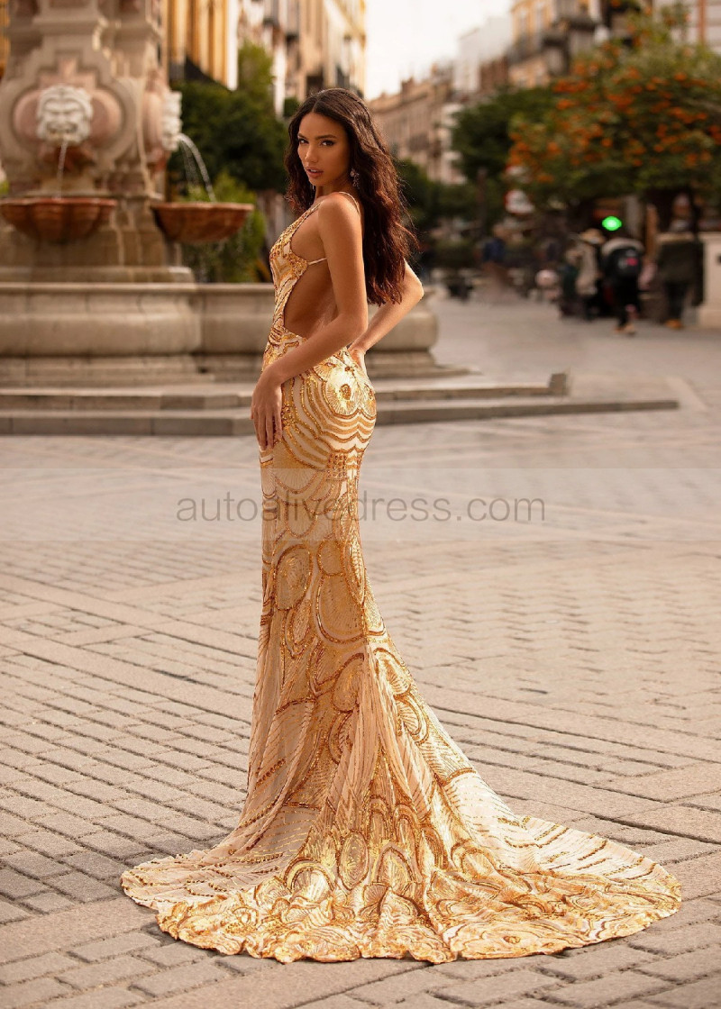 Deep V Neck Gold Sequin Low Back Evening Dress