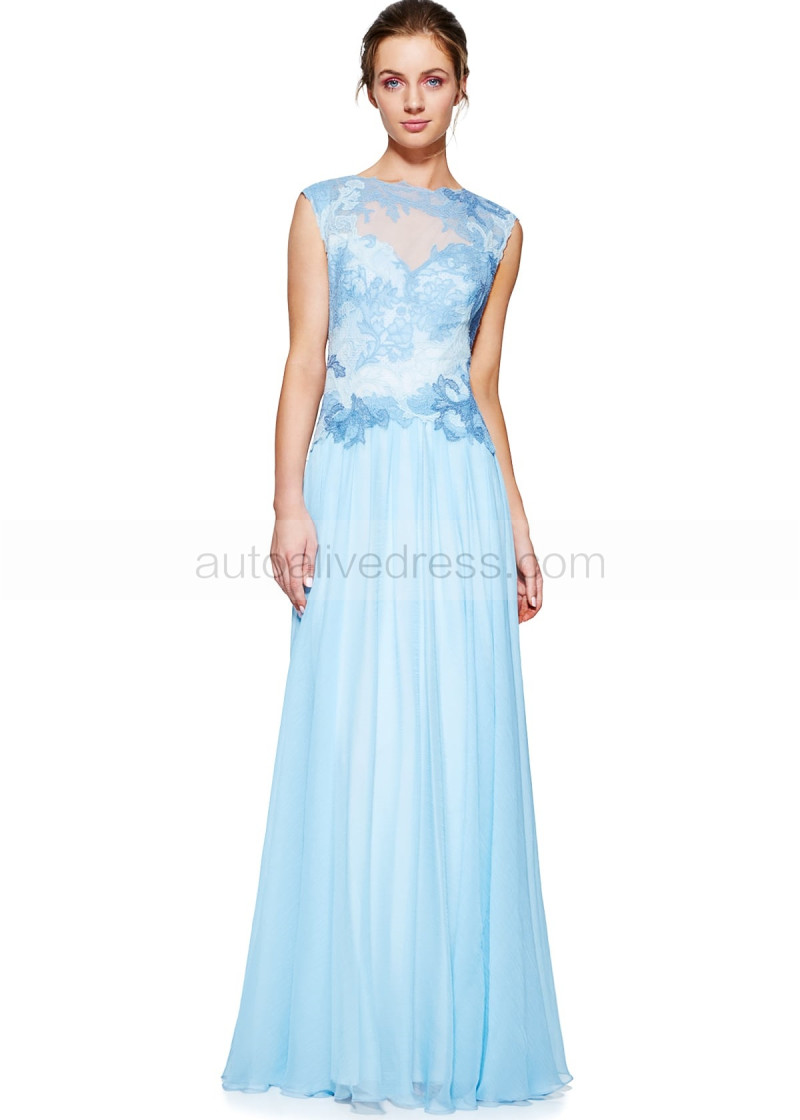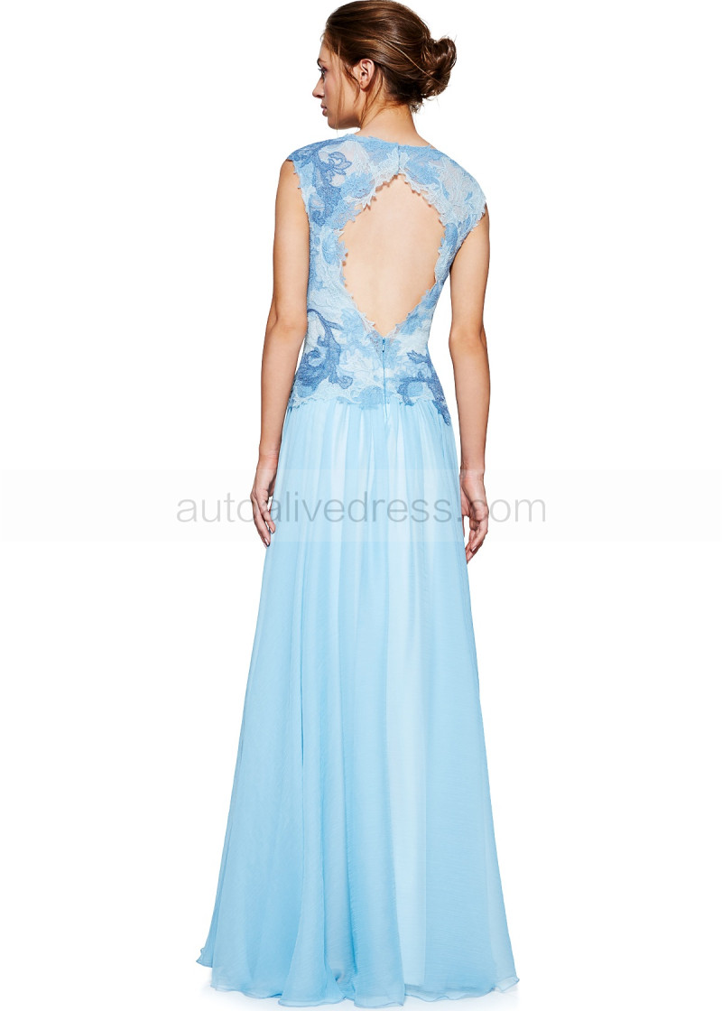 Illusion Neck Blue Lace Chiffon Diamond-shaped Back Evening Dress
