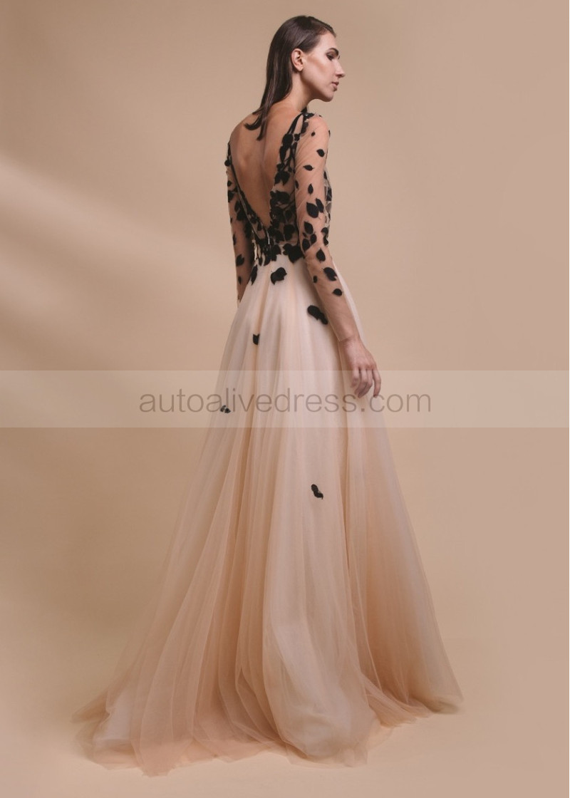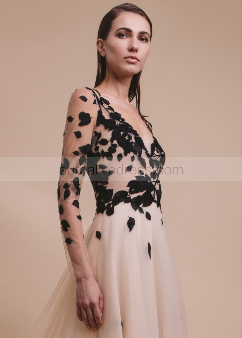 Long Sleeve Black Leaf Lace Nude Tulle Evening Dress