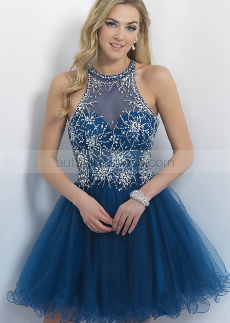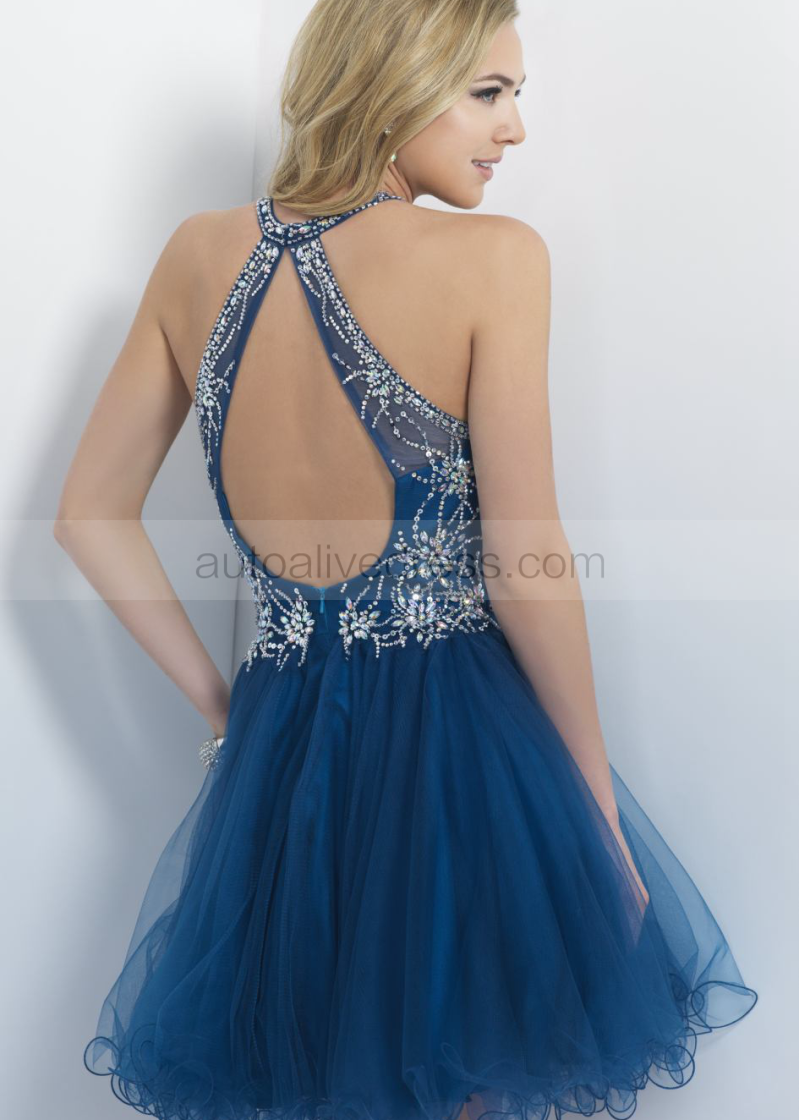 Navy Blue Tulle Beaded Halter Knee Length Prom Dress