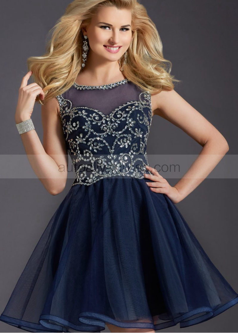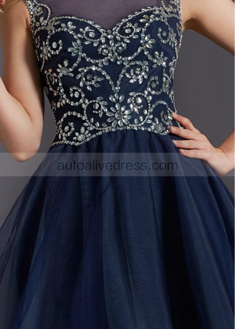 Navy Blue Tulle Beaded Slit Back Knee Length Prom Dress