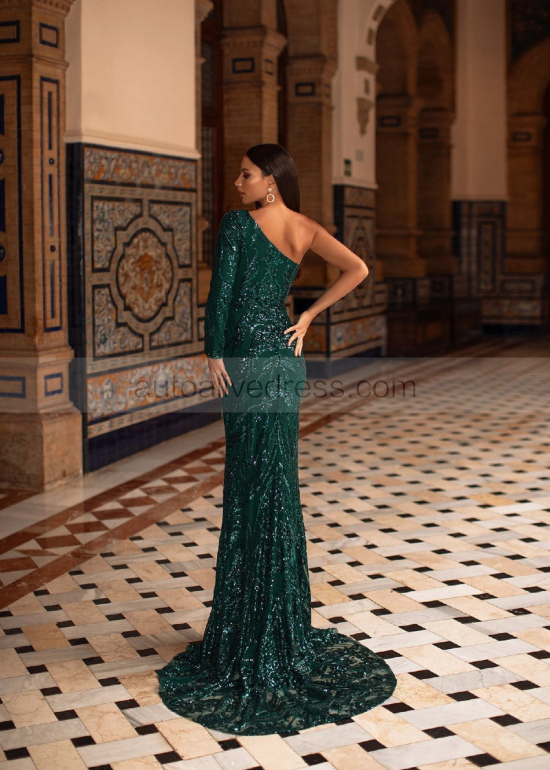 One Shoulder Emerald Sequin Stylish Evening Dress