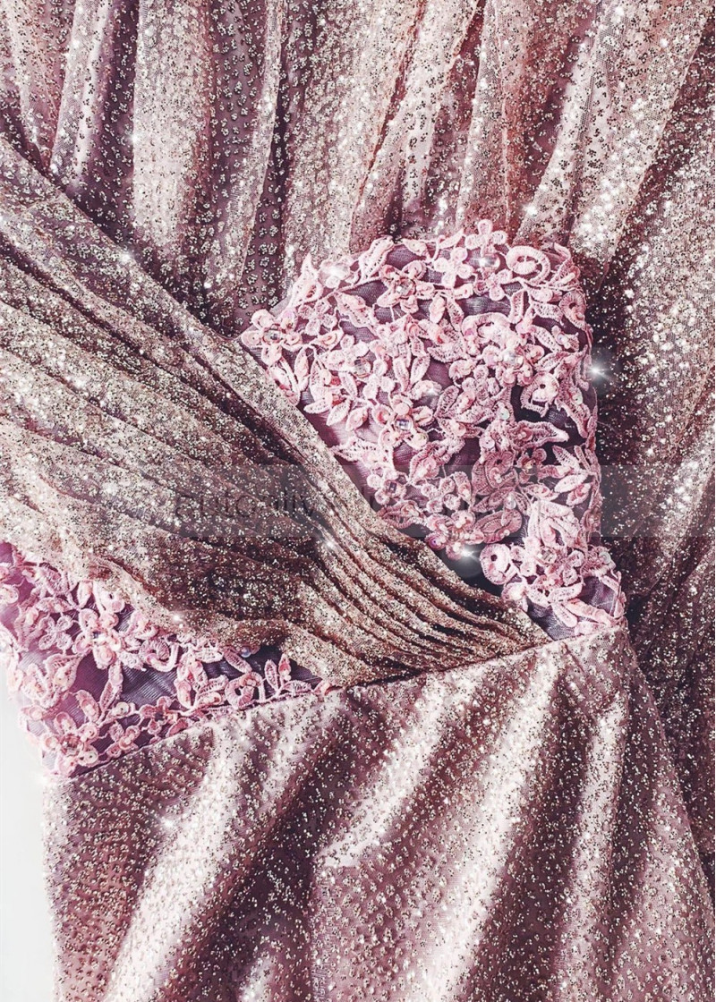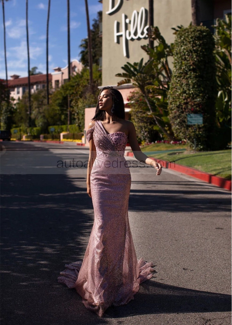 One Shoulder Rose Pink Beaded Lace Long Prom Dress