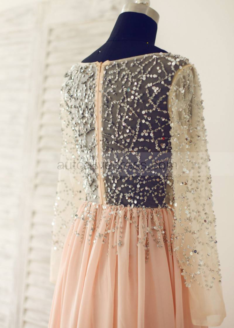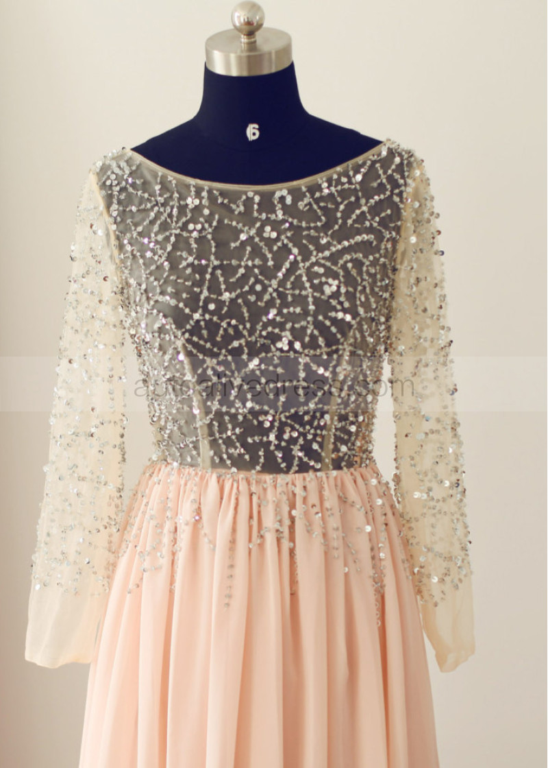Peach Pink Chiffon Beading Sheer Prom Dress