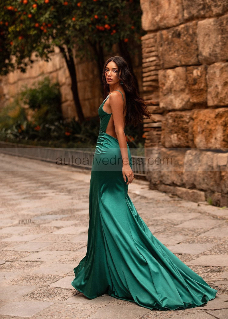 Plunging V Neck Emerald Satin Low Back Slit Evening Dress