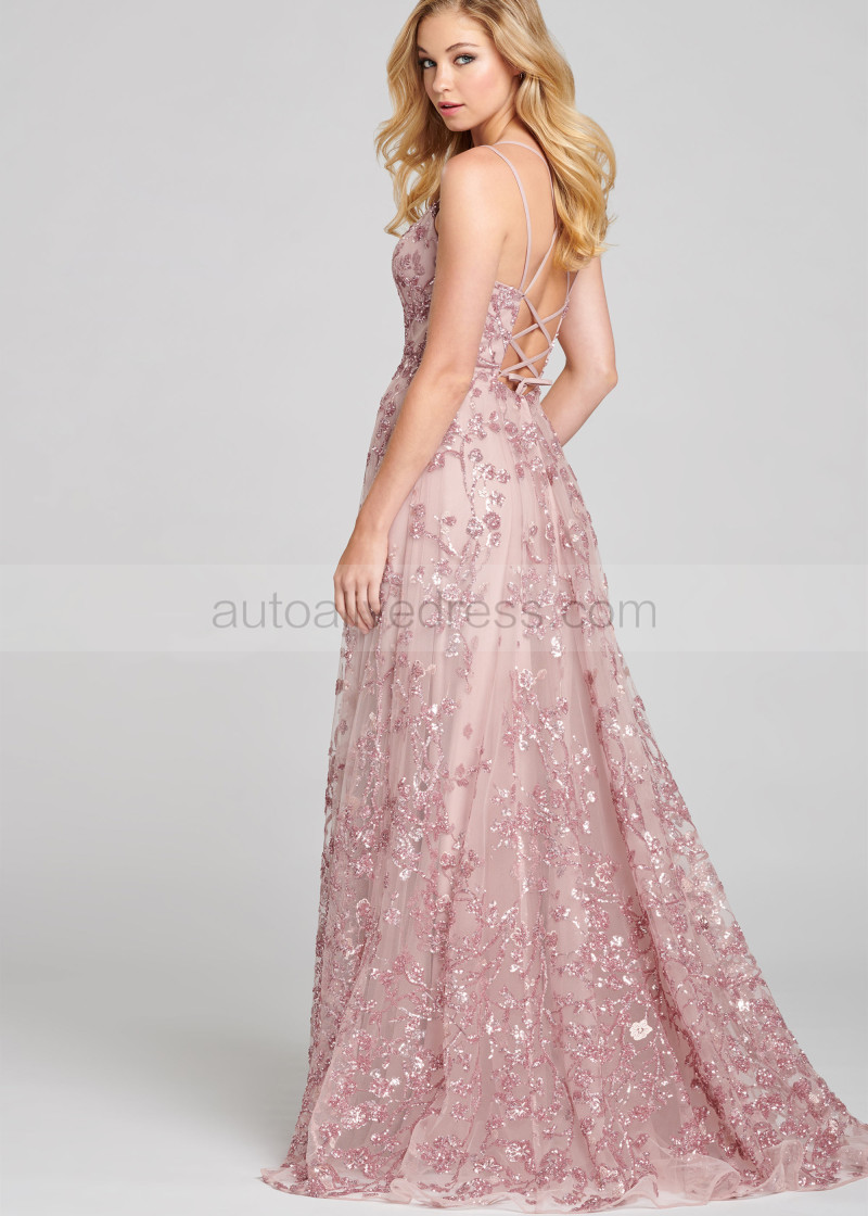 Pink Sequin Slit Lace-up Back Prom Dress
