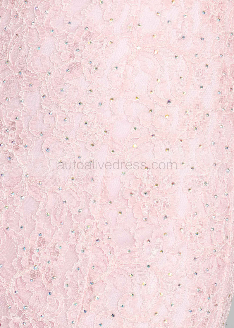Scoop Neck Beaded Pink Lace Slit Prom Dress