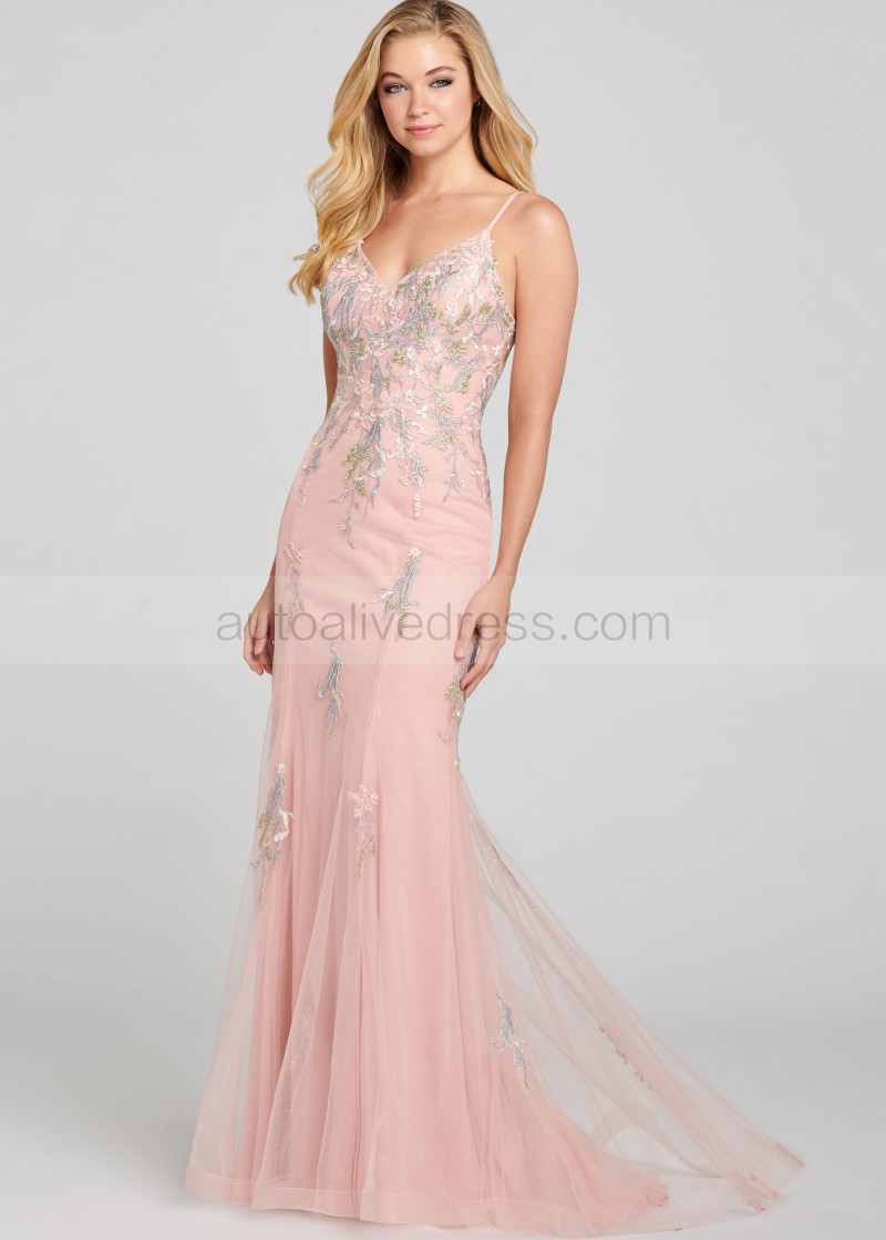V Neck Lace Tulle Prom Dress With Horsehair Hem