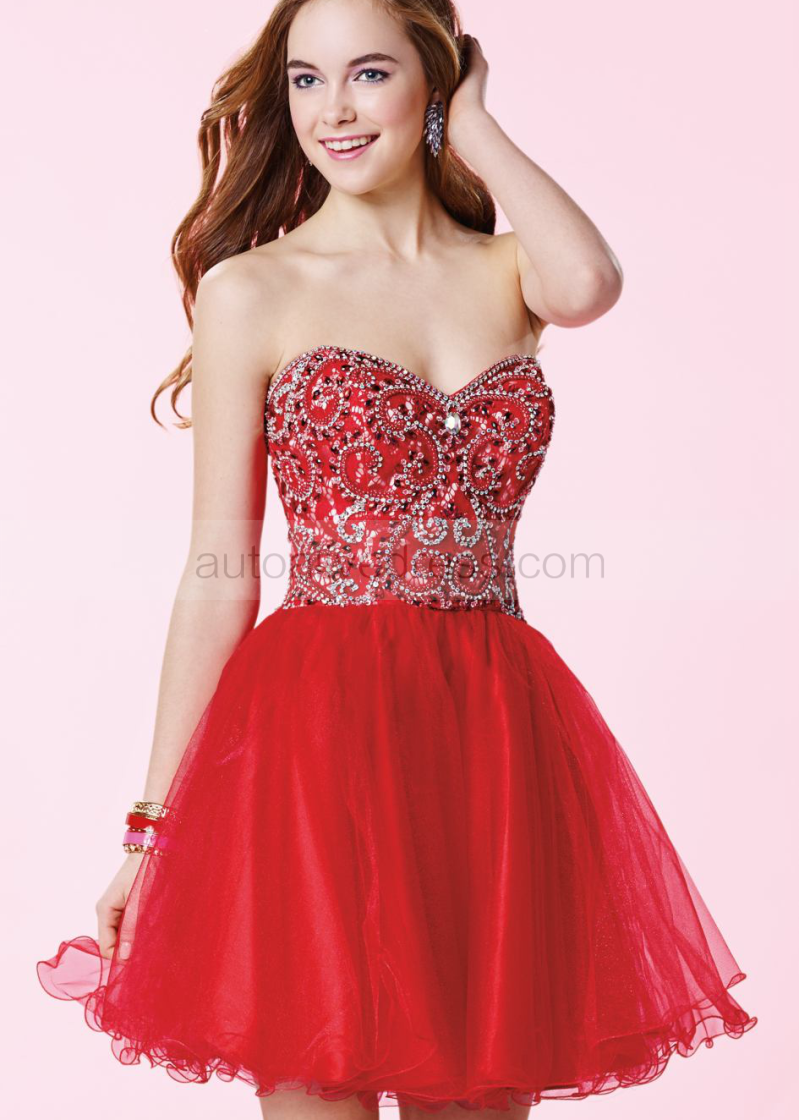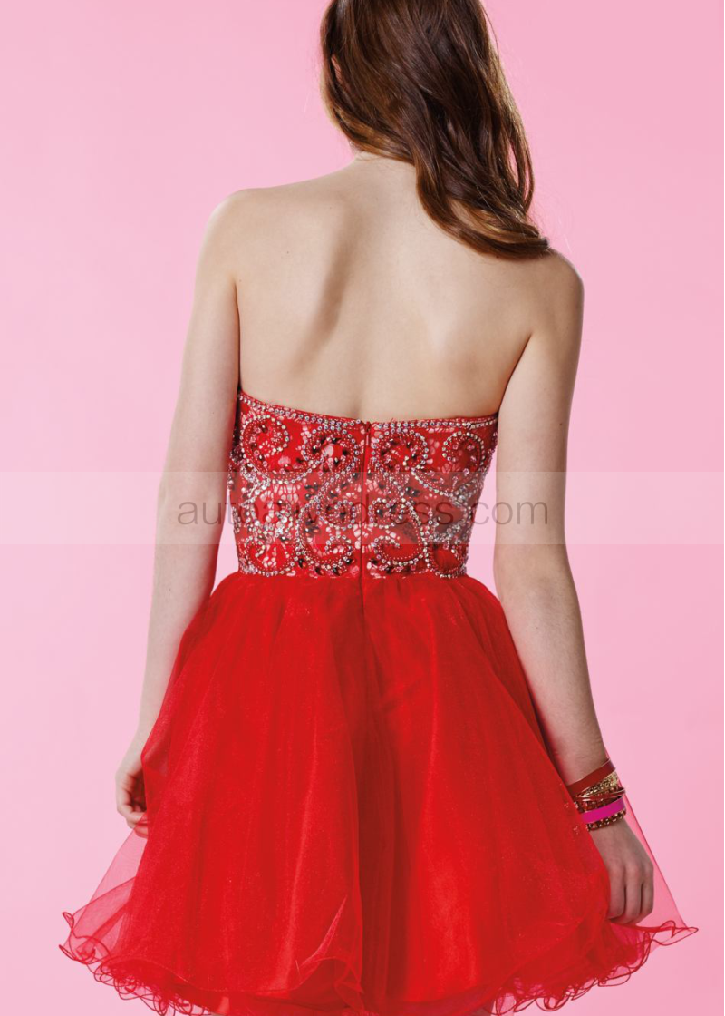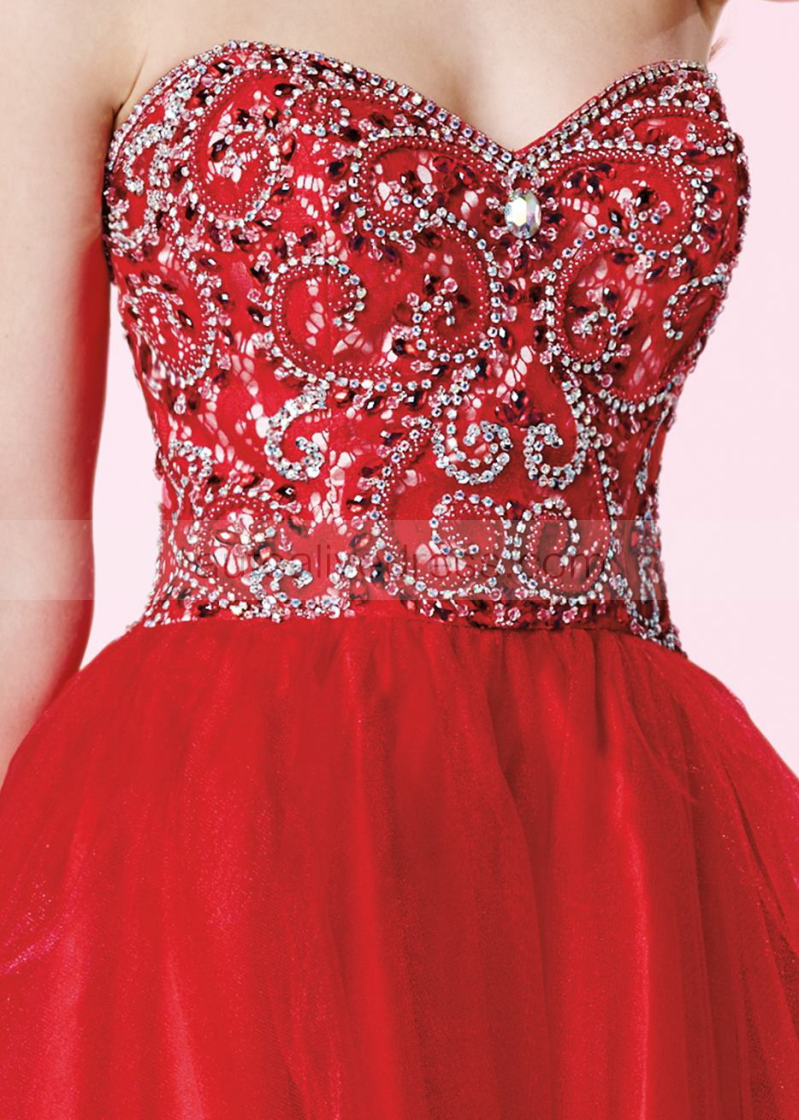 Red Tulle Beaded Sweetheart Neckline Knee Length Prom Dress