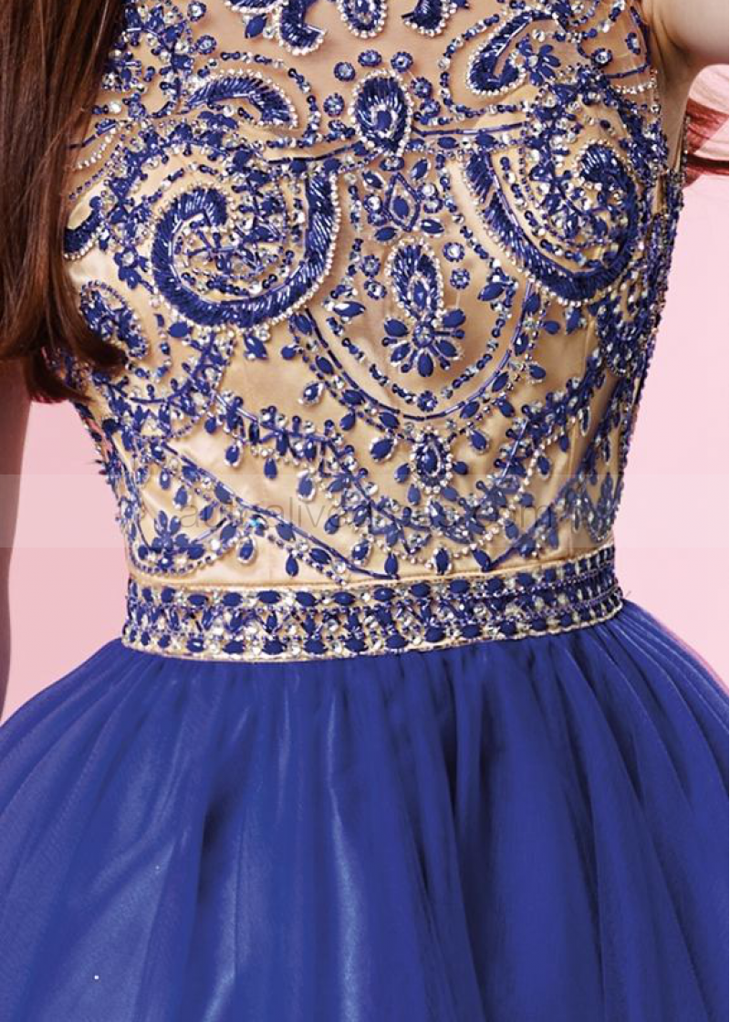 Regency Tulle Beaded Jewel Neckline Key Hole Back Knee Length Prom Dress