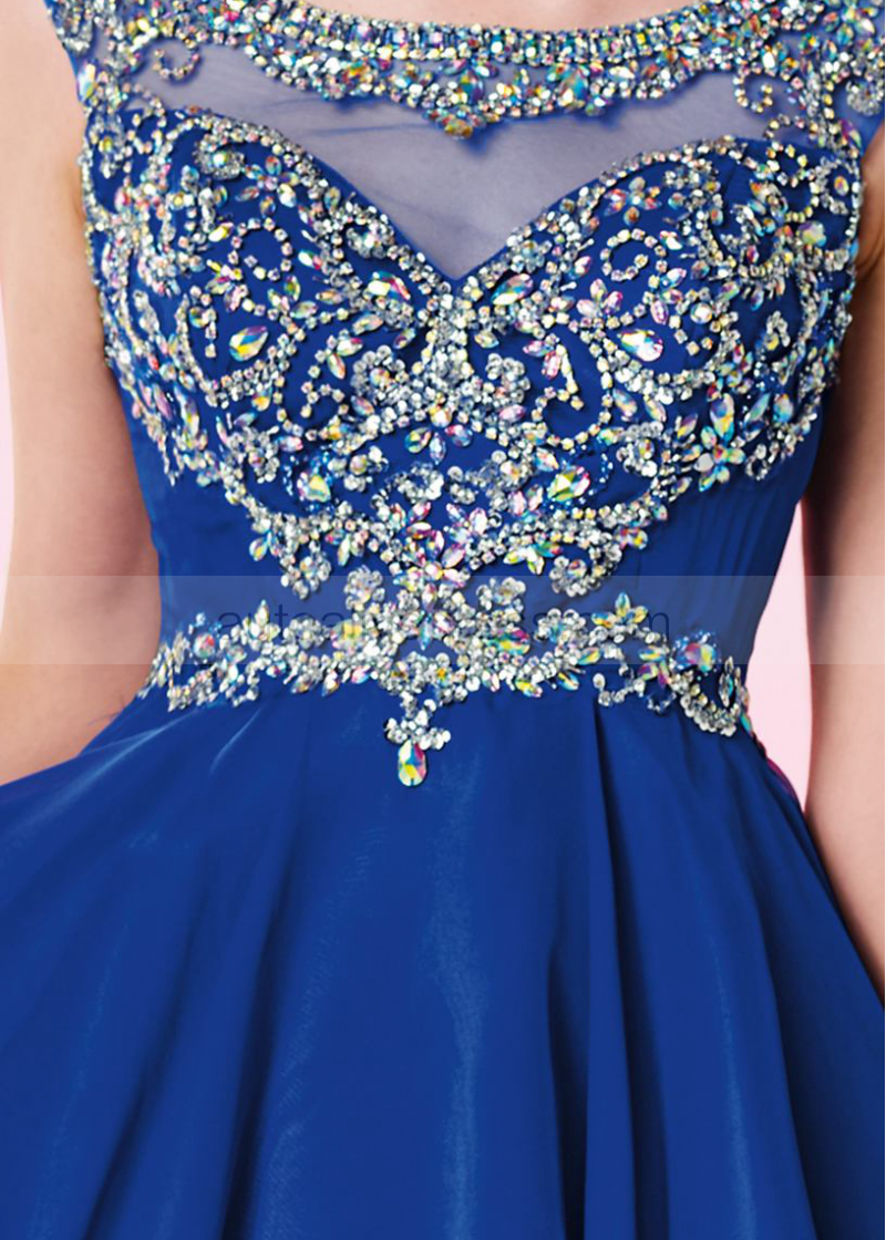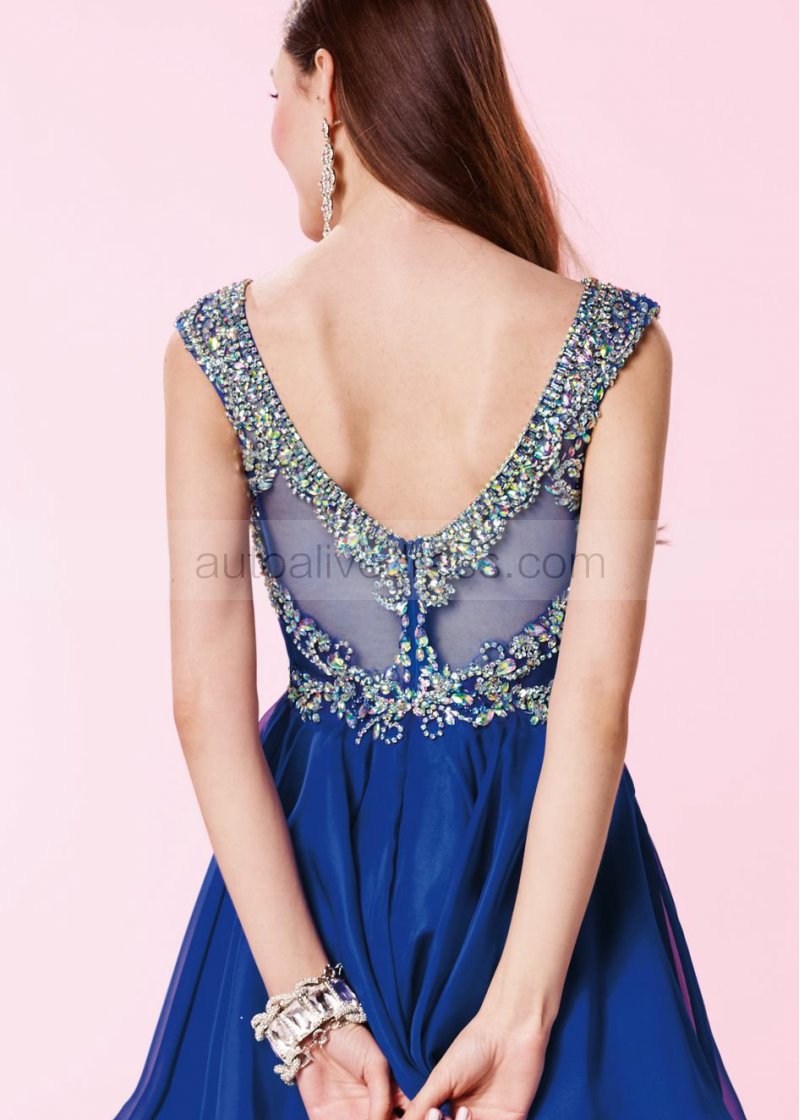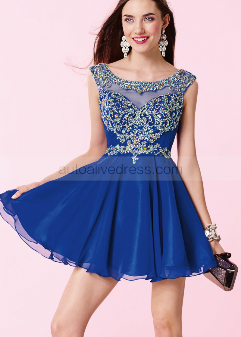 Royal Blue Chiffon Beaded Scoop Neckline V Back Knee Length Prom Dress