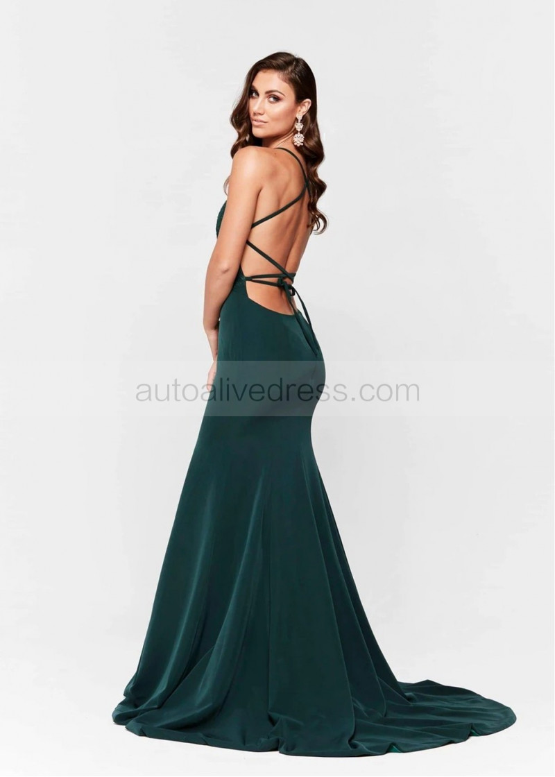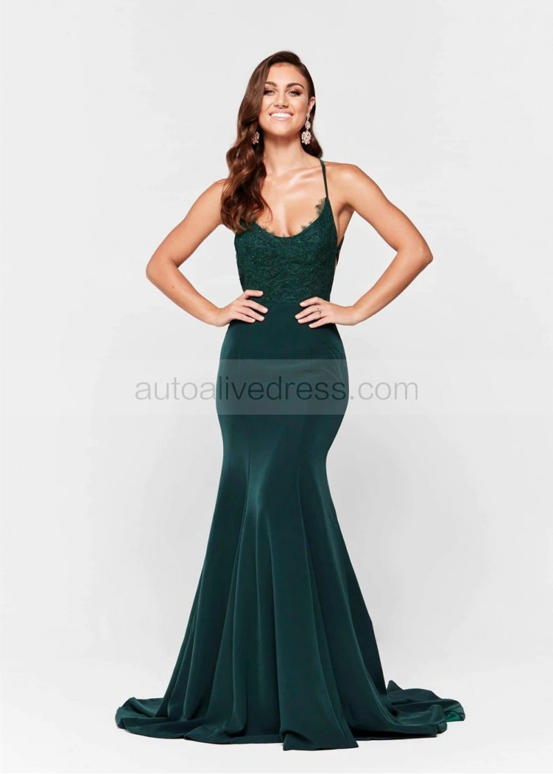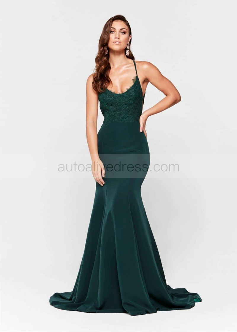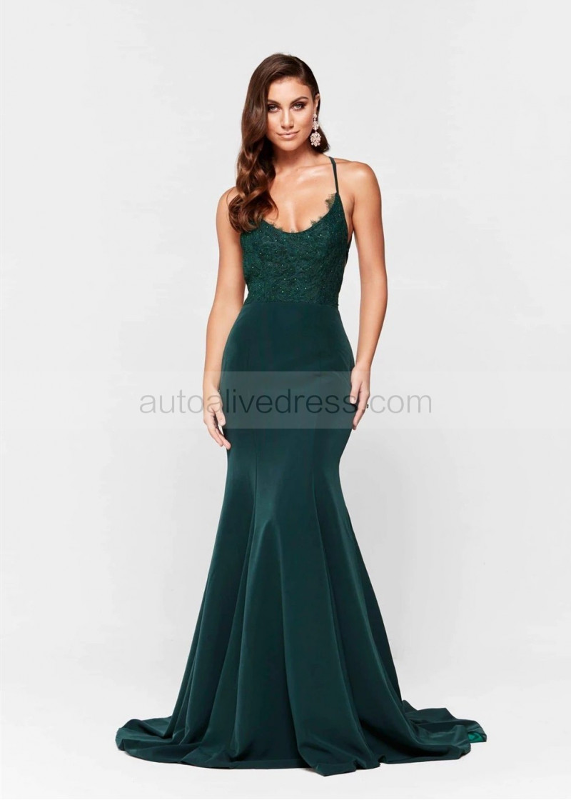 Scoop Neck Beaded Emerald Lace Long Prom Dress