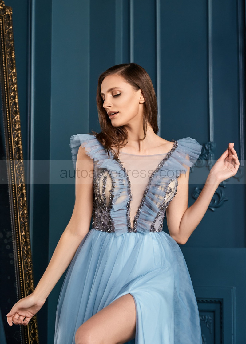 Sexy Glitter Tulle High Slit Evening Dress